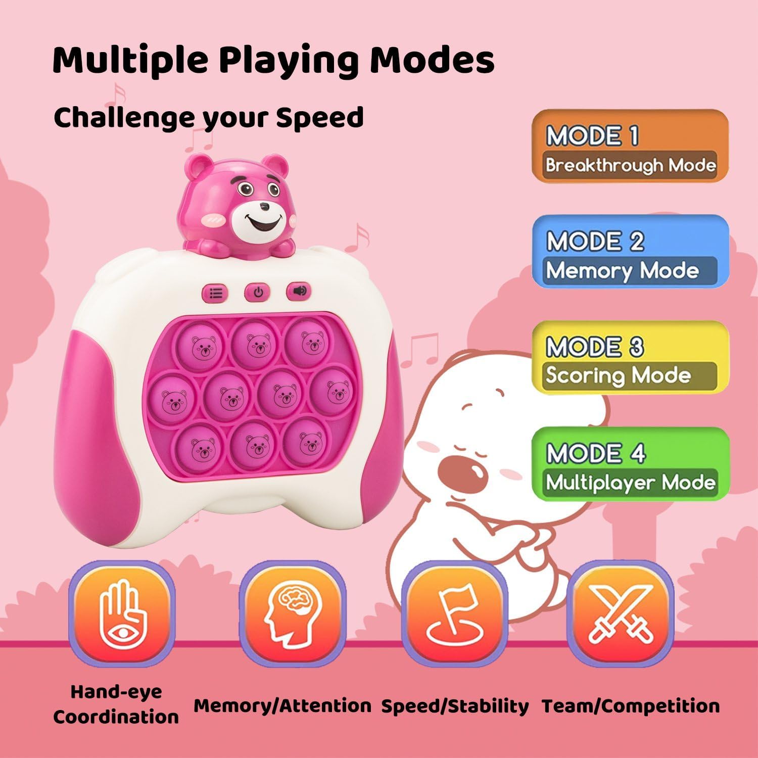• 🎮 4 Playing Modes: The quick push machine contains 4 interactive games, level-breaking mode memory mode, scoring mode, and multiplayer mode. Each mode has different difficulty levels, multiplayer mode is a great pk game. Definitely suited for kids and adults, this novelty fidget game can play a role on car rides, airplane trips, family gatherings, and party nights. Road trip must haves for teens, the children could be occupied with travel activities for hours; the party never boring anymore.