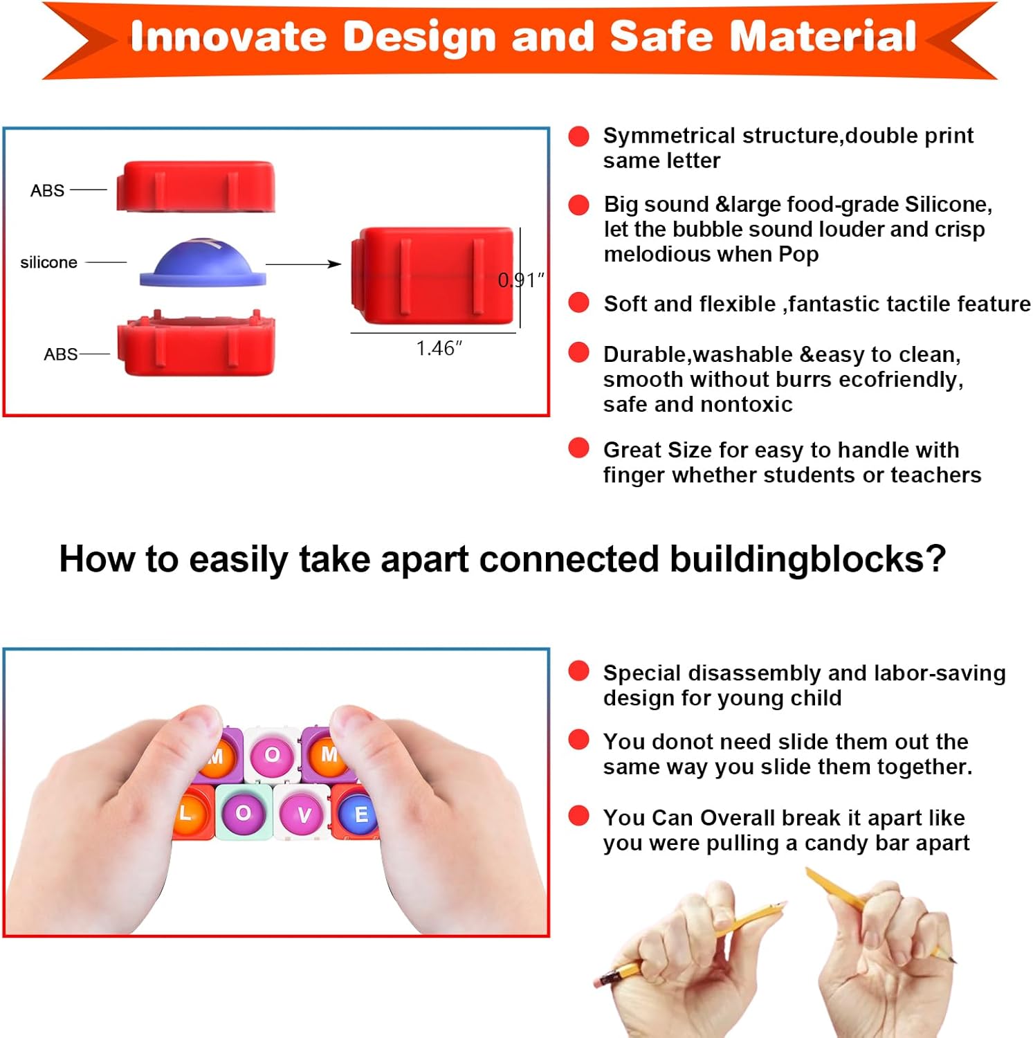 - .2️⃣【Pop-to-DIY Set】 🧑🔧Provide unlimited creativity.Build blocks at the same time popping bubbles to Exercise children's creativity and brain-hands ability. These pop fidget sensory building blocks are made of food-grade silicone. When you push and pop up, they will create a satisfying popping sound.it offers that kinesthetic/tactile /sound element to kids learning and joy.Our pops-its-toy have multiple functions, including sensory stimulation, stress relief, and cognitive development , improve concentration, enhance sensory