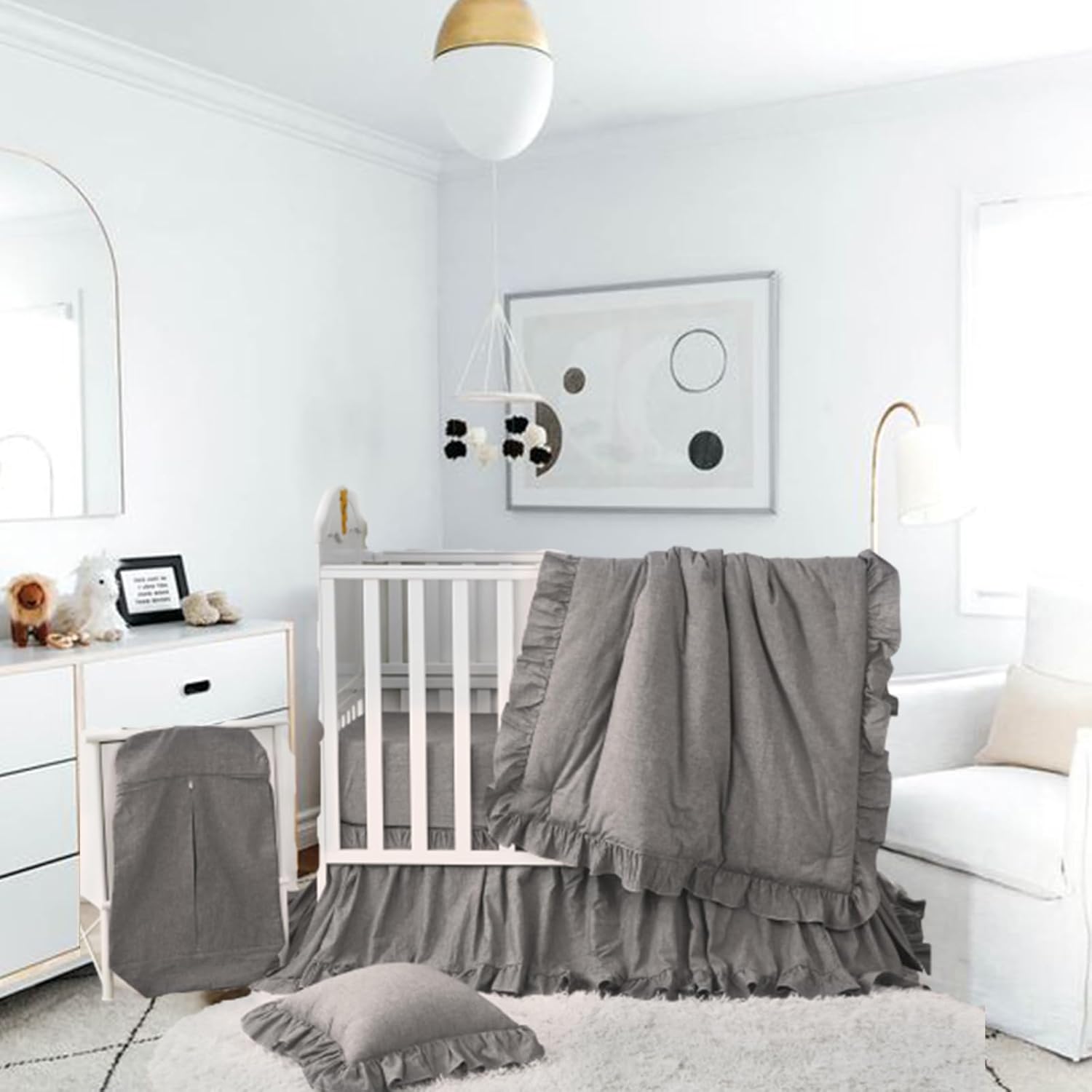 Brandream Baby Crib Bedding Set for Girls Boys Gender Neutral Boho Bohemian Farmhouse Chic Ruffle 6-Piece Nursery Bedding Set - 100% Washed Cotton Gray Grey