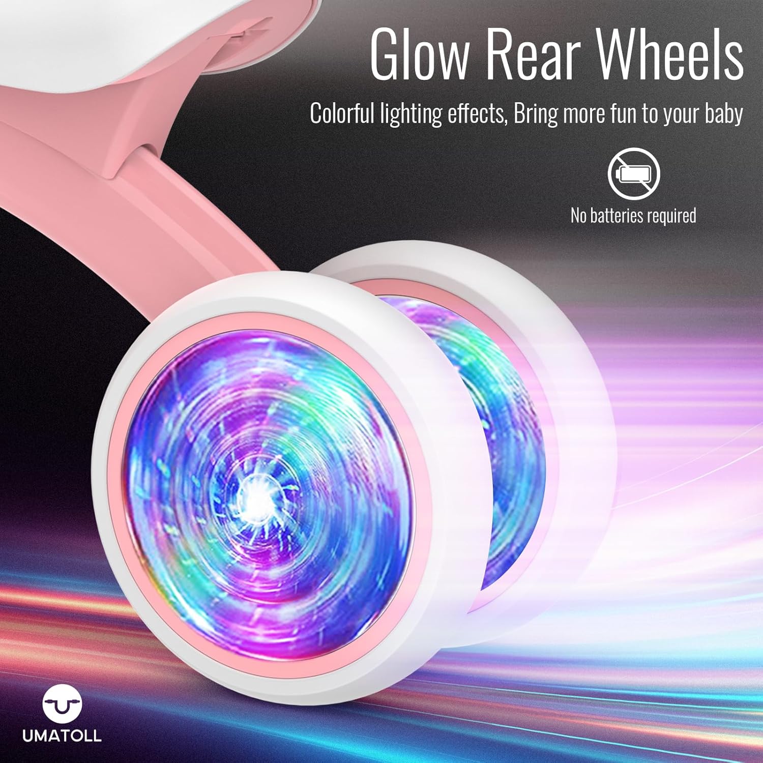 - GLOW REAR WHEEL: Colorful lighted rear wheels are more eye-catching to make babies more interested, inspires their curiosity. Bring more fun to your baby. No batteries required, just spin the wheels to glow.
