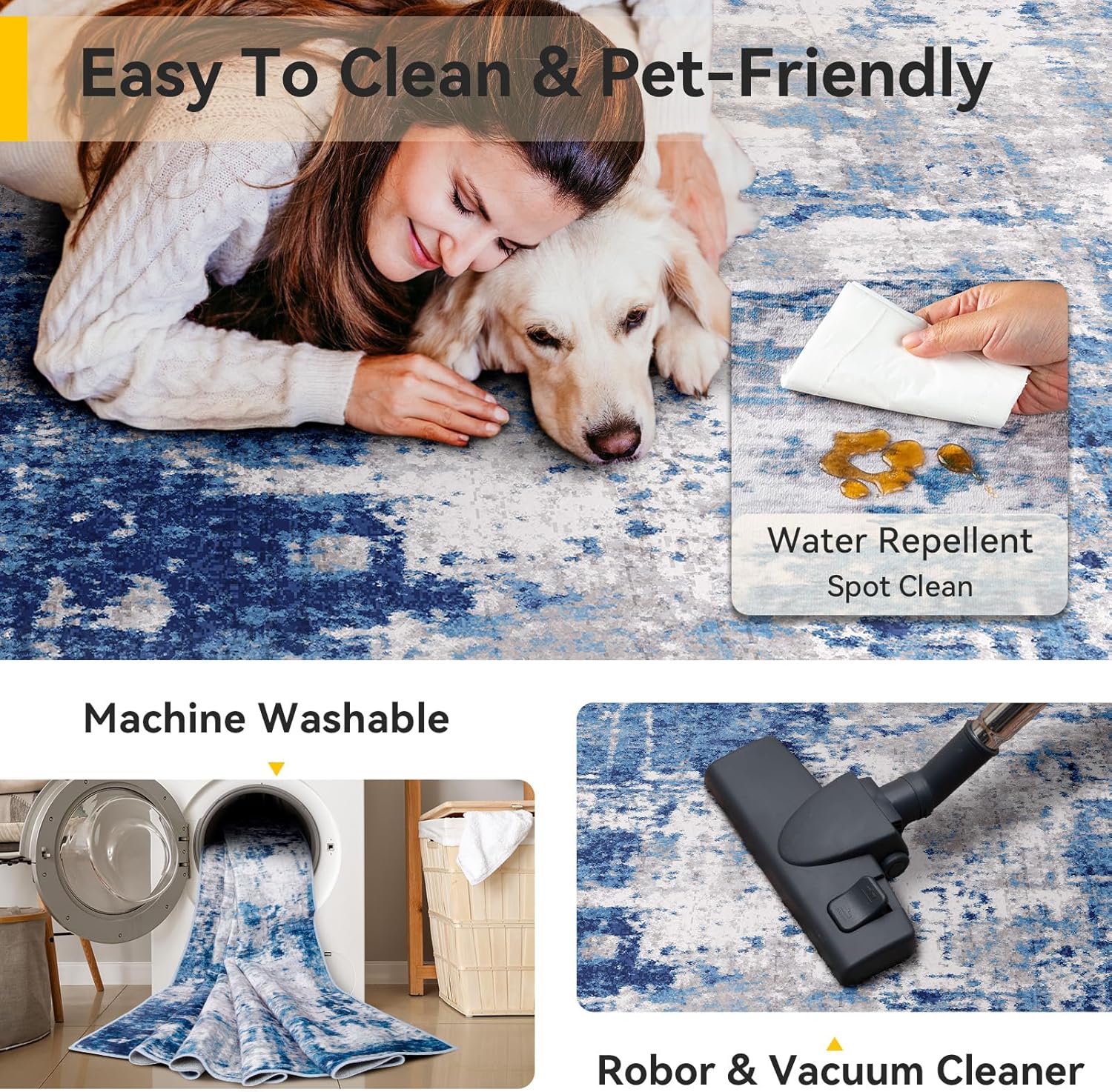 - Tides Series – Effortless style that flows with your life.This modern machine-washable non-slip rug features reinforced edges and a low-pile design that resists dirt. Its water-repellent surface makes spills easy to clean - liquids bead up for quick wiping. Simply machine wash in cold water (no bleach) to refresh. The non-slip backing keeps it securely in place. A perfect blend of function and contemporary design for active homes.