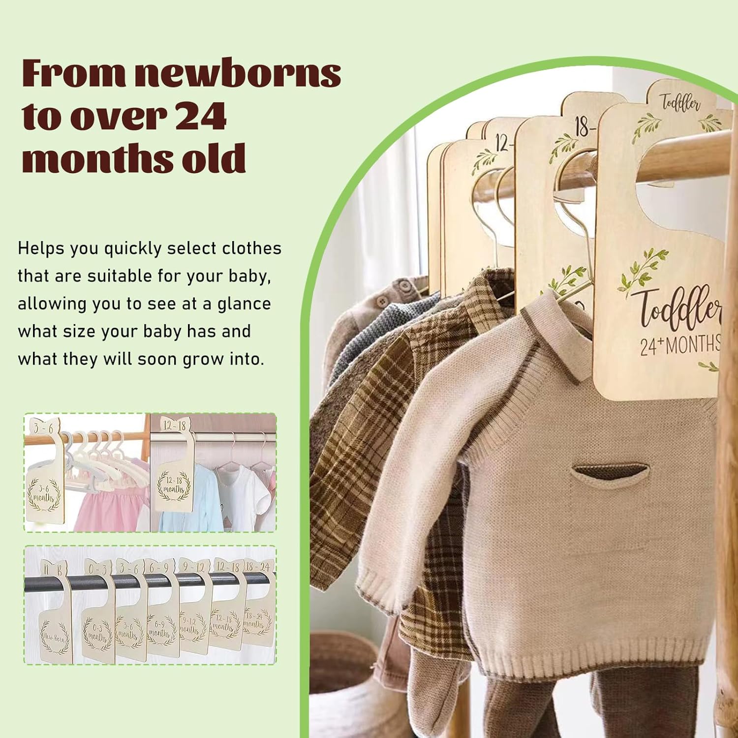 - Designs: The baby closet dividers make it super easy to stay organized and on top of all the baby clothes! Each set of baby clothes dividers has been printed with 8 different month numbers.Including 8 classifications: newborn, 0-3 months, 3-6months, 6-9months, 9-12months, 12-18months, 18-24months,24+months. This kind of design makes the dividers very efficient if you want to divide baby clothes for different months.