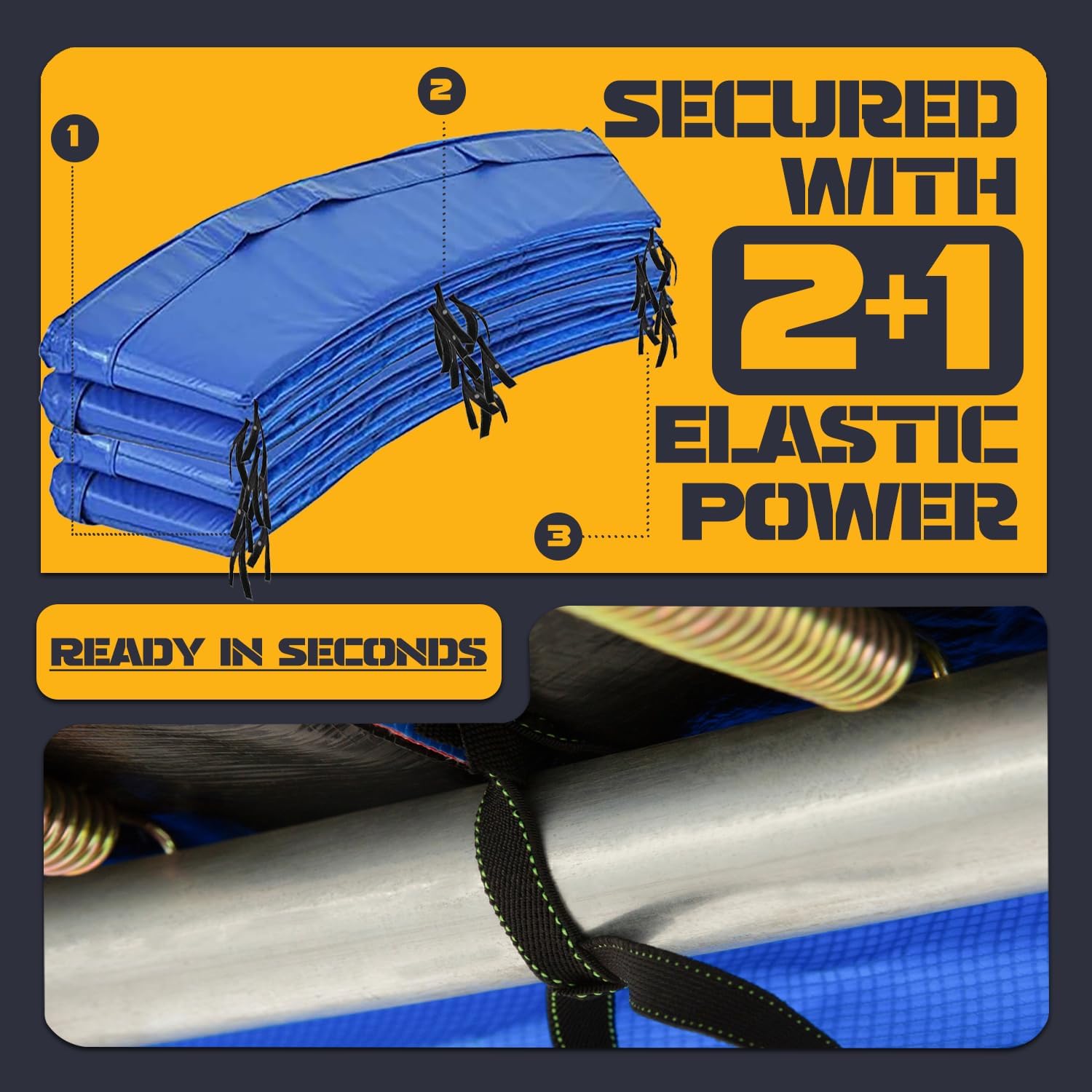 - 【2 Colors in 1 Trampoline Pad】This trampoline pad replacement with a double-PVC design, contains one blue side and black the other. It means you can change the color timely without buying a new one. TWO colors are available in ONE pad. Just flip the spring pad upside down, and with an easy velcro connection system, you can immediately change your trampoline's color. Express your creativity in seconds, making it a statement of fun and individuality.