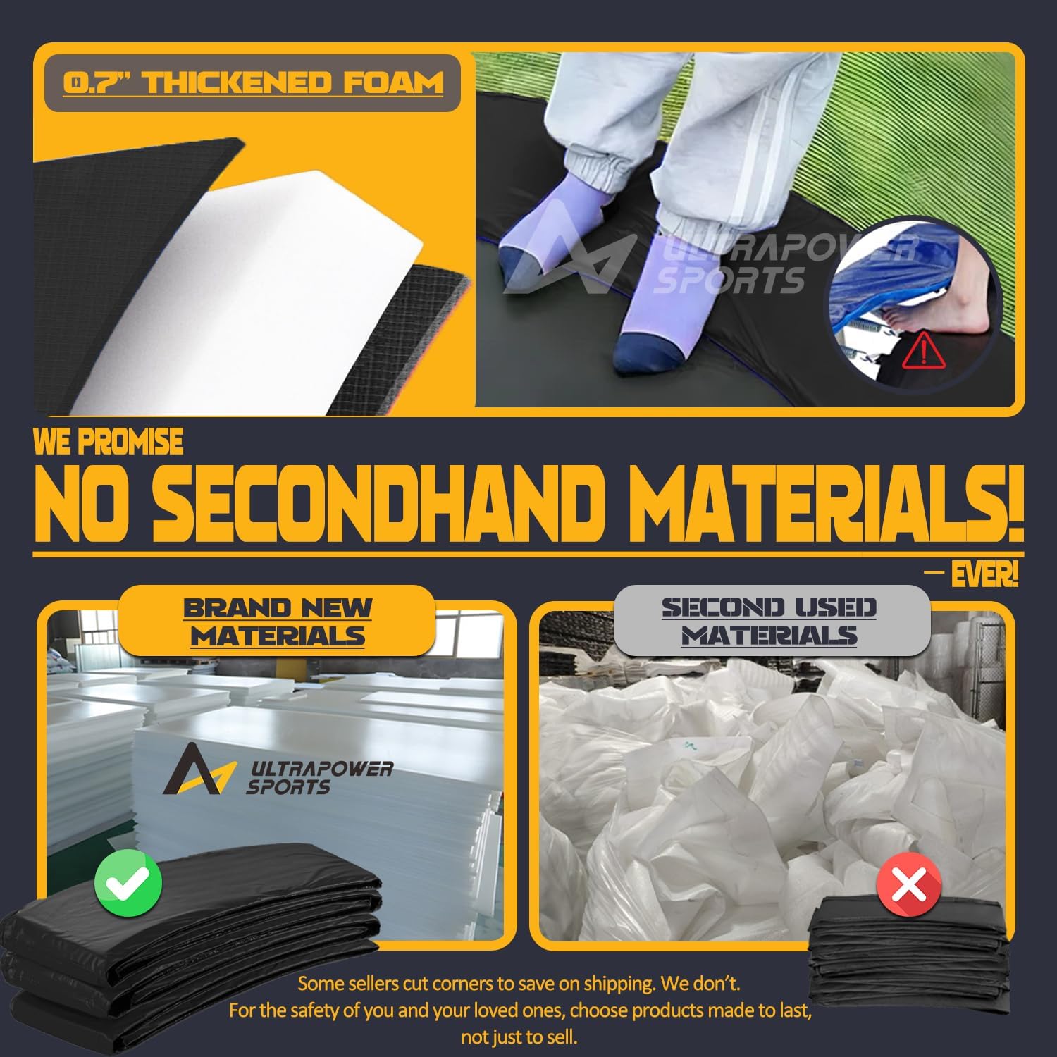 - 👨👩👧👧【270° All-Around Safety Protection】👨👩👧👧At ULTRAPOWER SPORTS, your child's safety comes first! Our trampoline pad replacement is designed to shield kids from exposed springs, preventing injuries while they jump. The extended 270° protective cover wraps around the trampoline frame, offering inside-out protection. Built for durability, it features a 0.55mm thick PVC surface + 0.6-inch protective cotton + an ultra-dense PE bottom, ensuring maximum safety, comfort and fun.