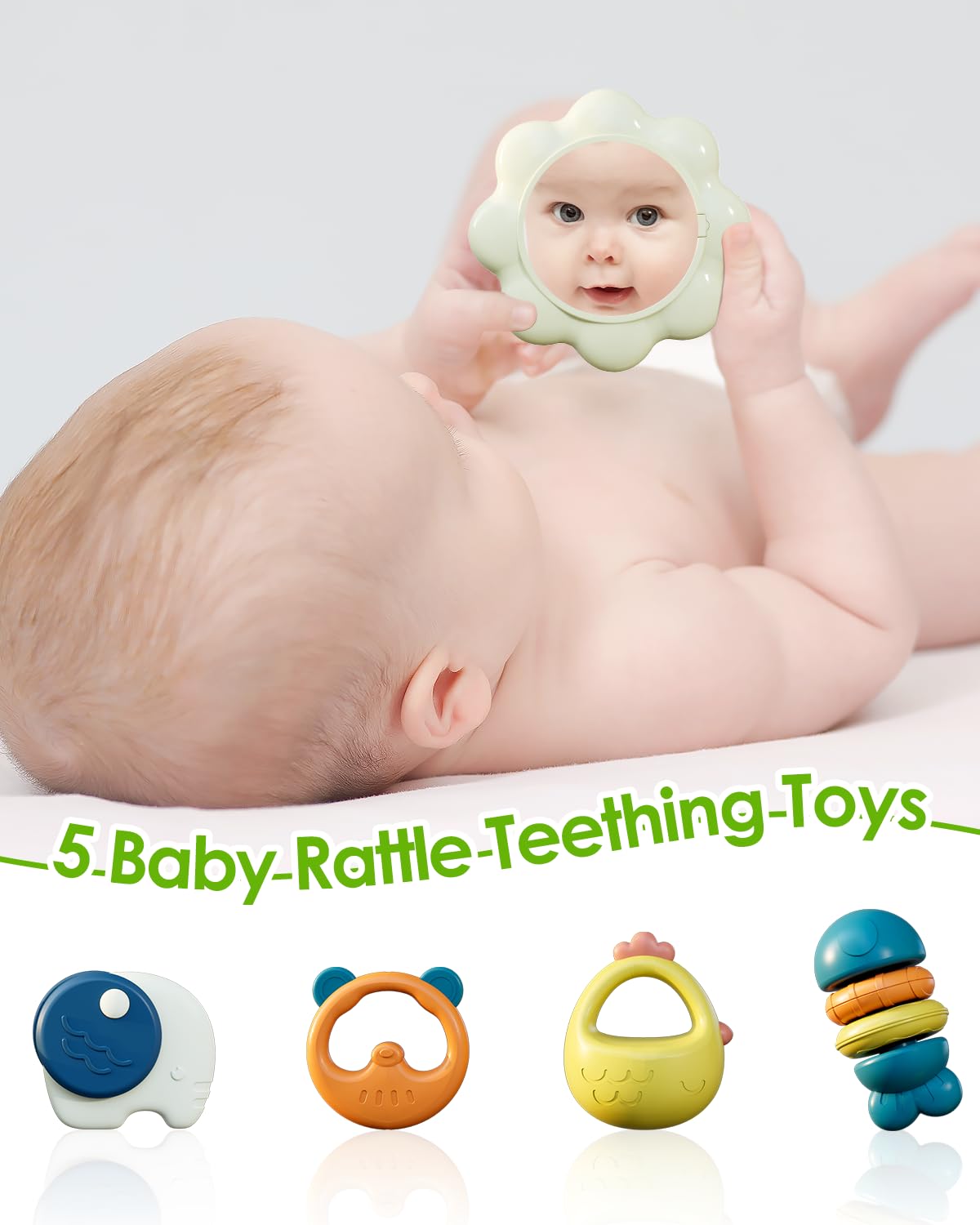 - 【5 In 1 All-Round Development】4 Removable sensory toys and 1 flower mirror, fully meet the baby's growth needs. 4 Toys: Baby teapot rattle, water cup rattles for newborn baby touching-growing,and TV rattle,clock rattle for improve baby responsiveness.Piano keyboards touching for graphics ,listening .All for colors cognitive. 1 flower mirror,as an important way for self-discovery.
