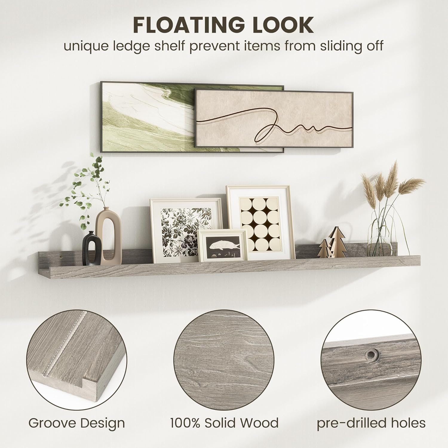 Picture Ledge Shelf, 48 Inch Long Floating Shelves for Wall, Nursery Bookshelf for Storage with Lip, Rustic Elm Wood Photo Ledge Shelves for Bedroom, Living Room, Kitchen (Grey, 48in Set of 2)