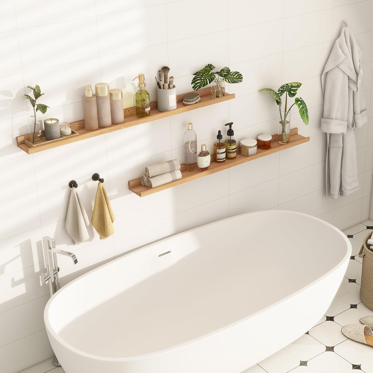 Picture Ledge Shelf, 48 Inch Long Floating Shelves for Wall, Nursery Bookshelf for Storage with Lip, Rustic Elm Wood Photo Ledge Shelves for Bedroom, Living Room, Kitchen (Natural, 48in Set of 2)