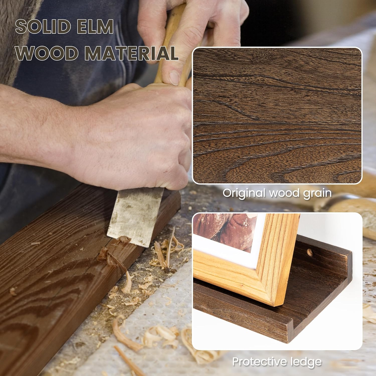 - ă100% Solid Elm Wood ShelvesăOur handcrafted wood shelves are made of high-quality reclaimed elm wood, which features distinctive grain patterns and beautiful wood knots, adding a touch of character to your living space. The shelves come in a rustic natural finish that ensures lasting durability while also making each shelf unique.
