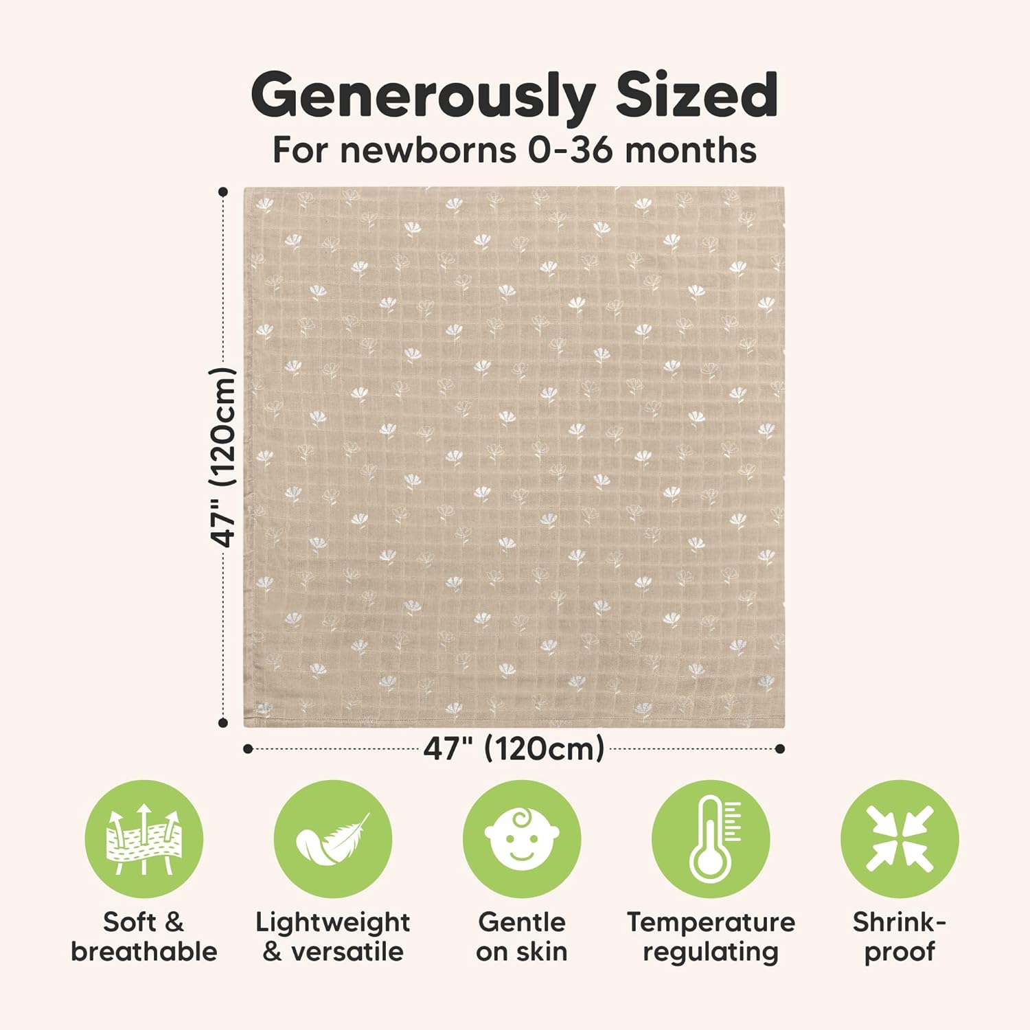 - Generously Sized - Designed large at 47" by 47", the Lumi Muslin Baby Blanket is made to grow with your baby. Suitable for premies, newborns, infants and toddlers up to age 5. The perfect lovey for home, preschool, and grandparent's place.