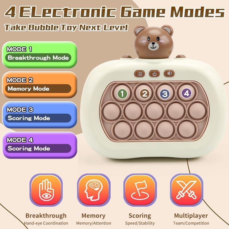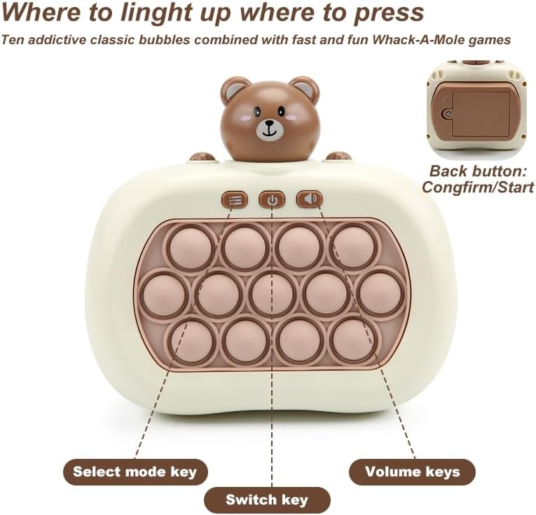 - 【2024 Upgraded Puzzle Speed Push Game】This puzzle game machine combines the classic bubble pressing game and the whack-a-mole game that tests speed and eyesight. Quickly press the lighted bubble to break through the level. The upgraded version of the plush toy is more challenging, which can effectively help children exercise their thinking and accompany their intellectual growth.