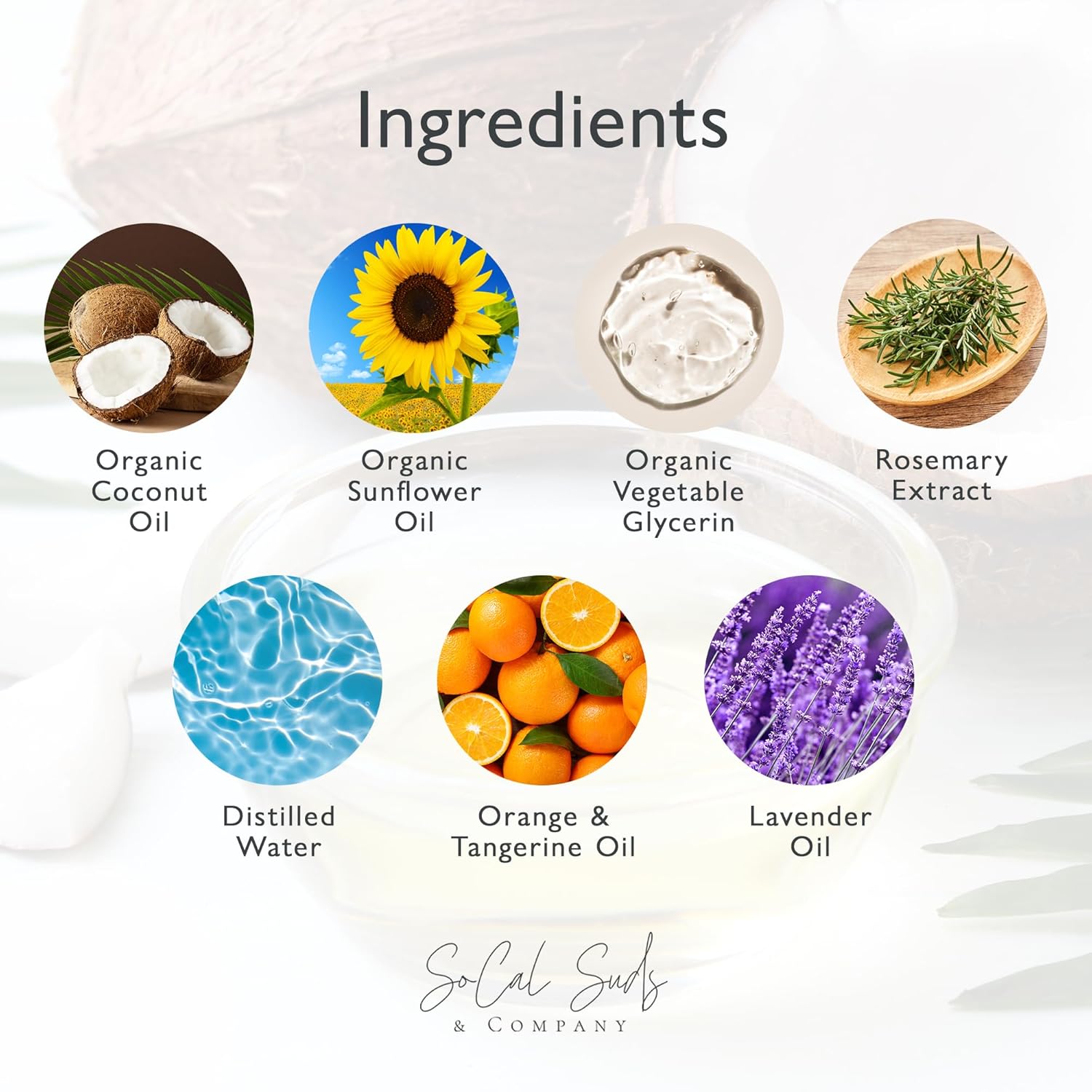 - GENTLE CARE IN EVERY BUBBLE: SoCal Suds & Company's foaming organic baby wash and shampoo features saponified oils of organic sunflower and coconut. This gentle formula is enriched with distilled water, organic vegan glycerin, and rosemary extract, offering a nurturing cleanse that honors the delicate balance of any skin type. Embodying our commitment to natural and organic care.