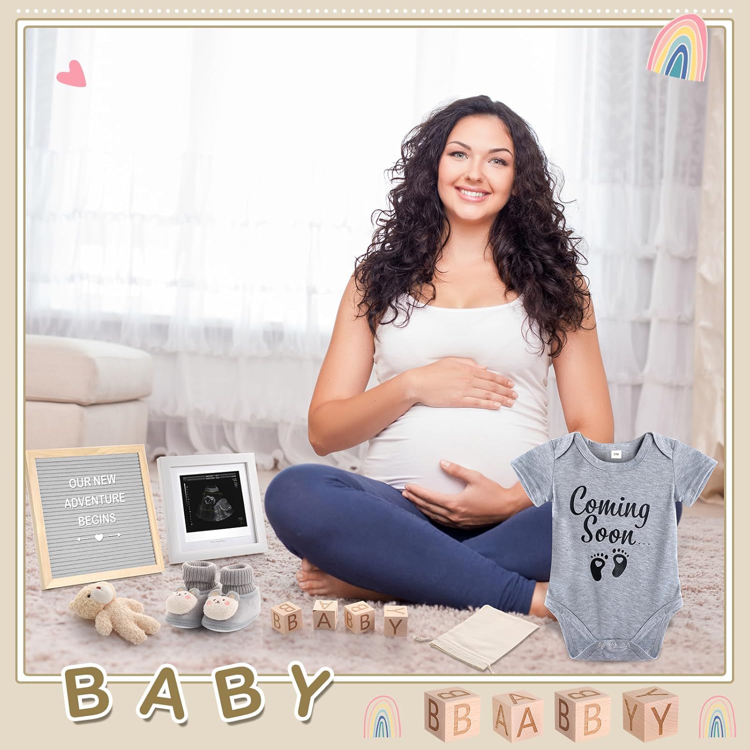 9 Pcs Pregnancy Announcement Set Pregnancy Reveal Ideas Felt Letter Board Baby Bodysuit Booties Photo Frame Bear Plush Wood Blocks for Coming Soon Baby Announcement(Gray)
