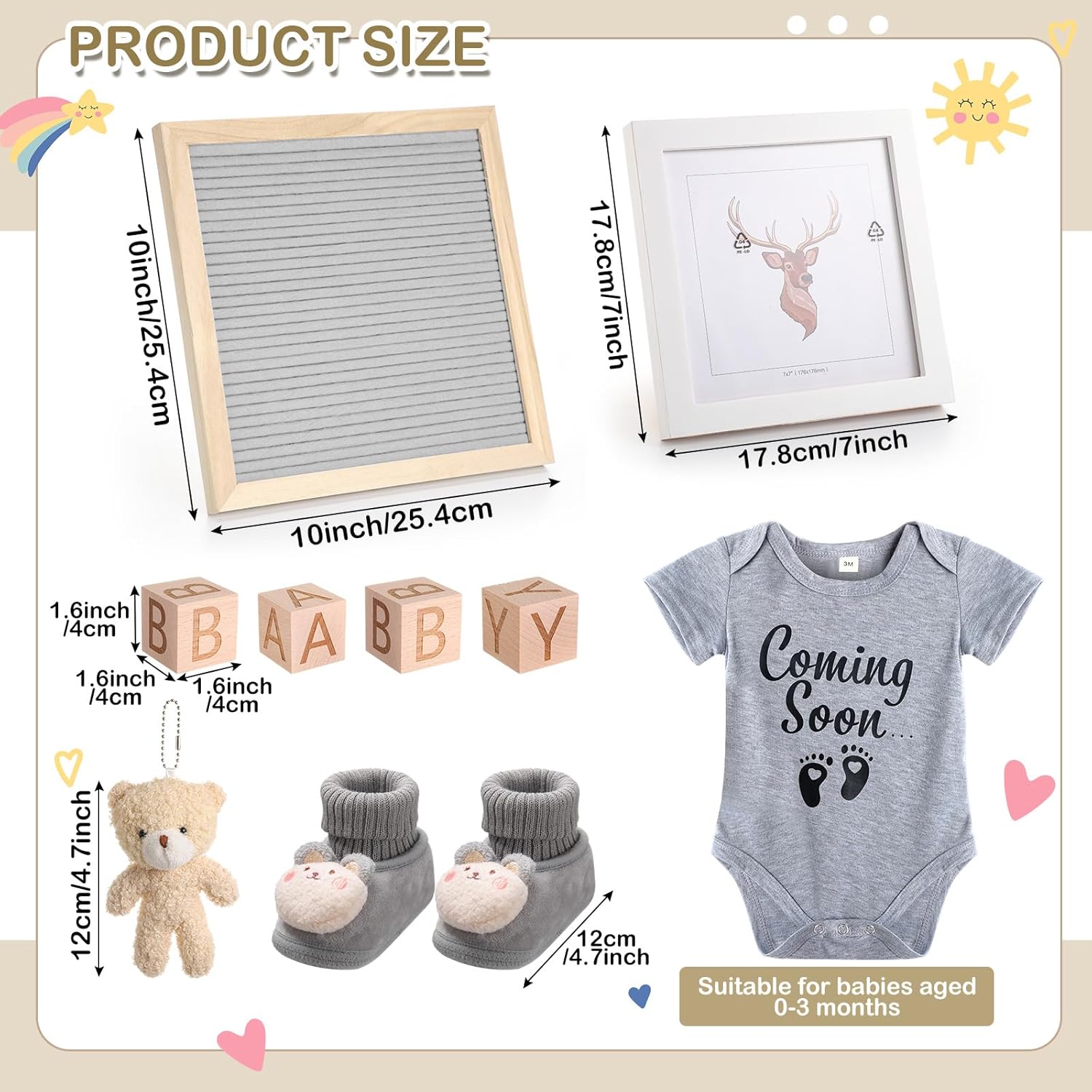 - Adorable Pregnancy Announcement Set: this set is the impressive and lovely way to announce your pregnancy; Including 1 kit of felt letter board (equipped with 340 pcs plastic letters and numbers, symbols, 1 drawstring pouch), 1 short sleeve baby bodysuit, 1 white photo frame, 1 bear plush, 1 pair of baby booties, and 4 baby wood blocks; Acting as a beautiful keepsake to memorize the lovely moment