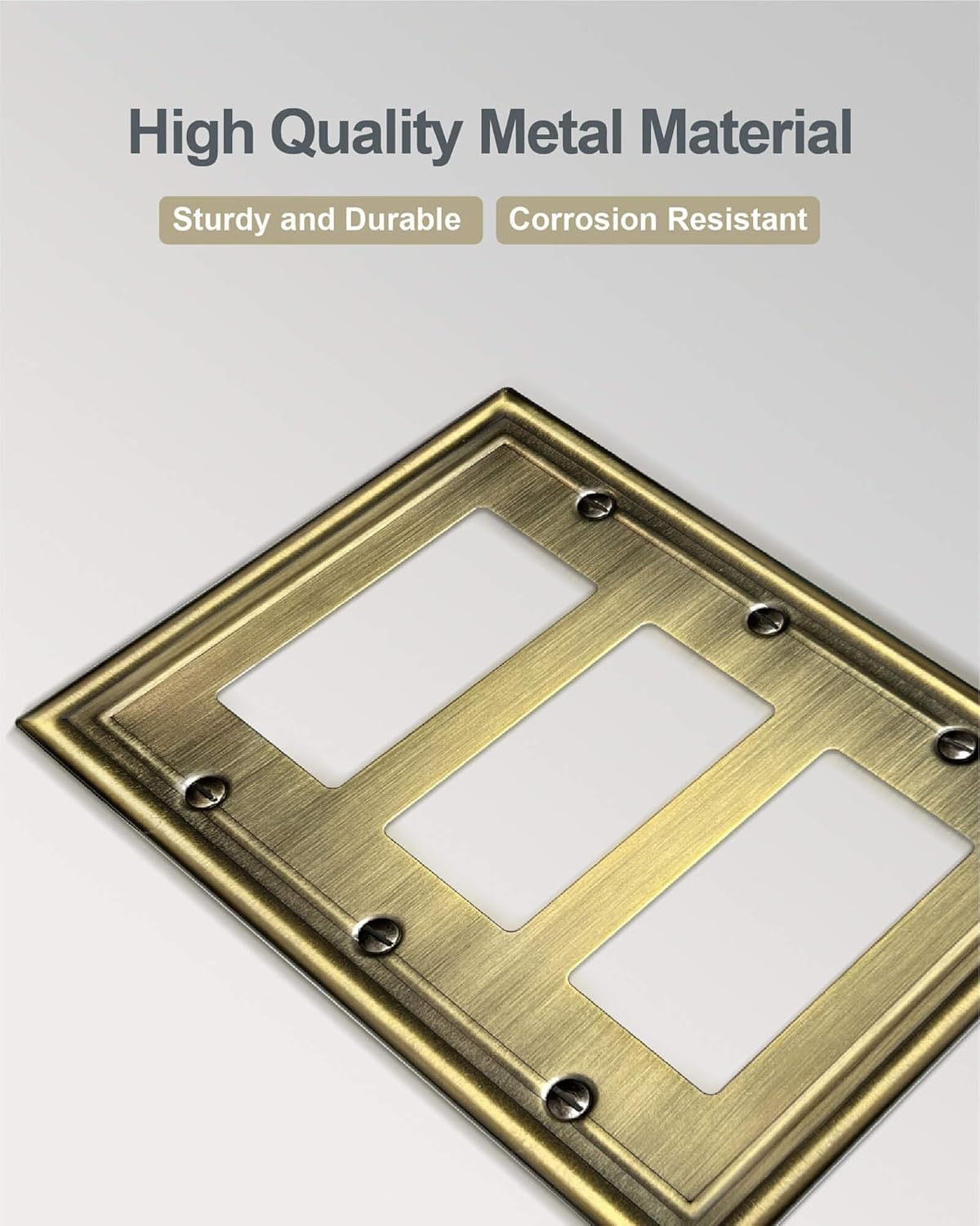 1 Pack Triple Decorator Wall Plates, Metal Electrical Outlet Covers for Receptacles, Dimmer Switches, GFCI Outlets, Antique Brass, 6.77''*4.88'', Midisze, 3 Gang