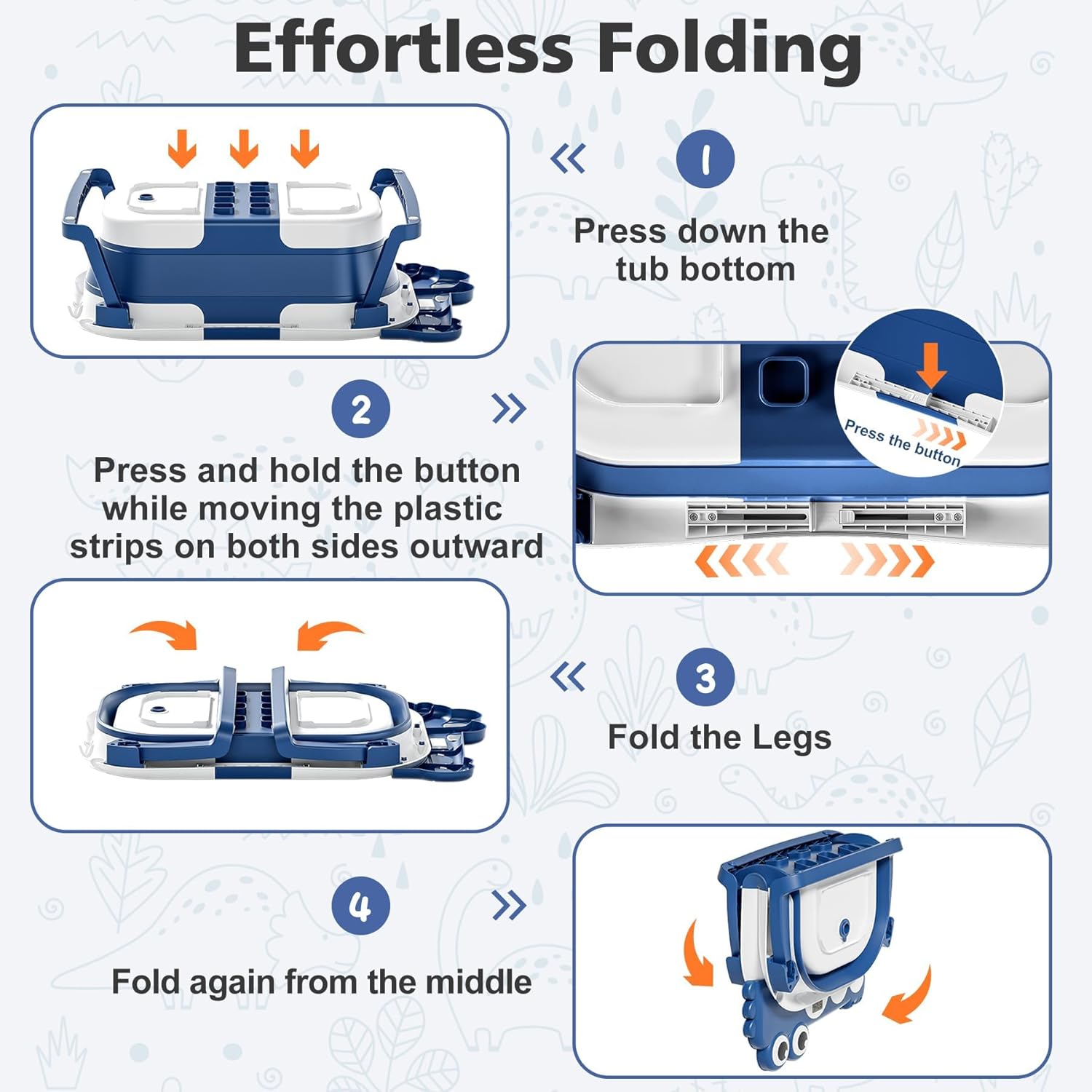 - Double-Fold Collapsible Design: TPN collapsible baby bathtub features an ingenious double-fold design, compactly measuring less than 4 inches in thickness. This facilitates effortless storage in any corner and enhances portability for on-the-go convenience, making it a perfect companion both at home and during travel. The off-the-floor drain with a user-friendly rubber plug guarantees seamless draining without the need for relocation.
