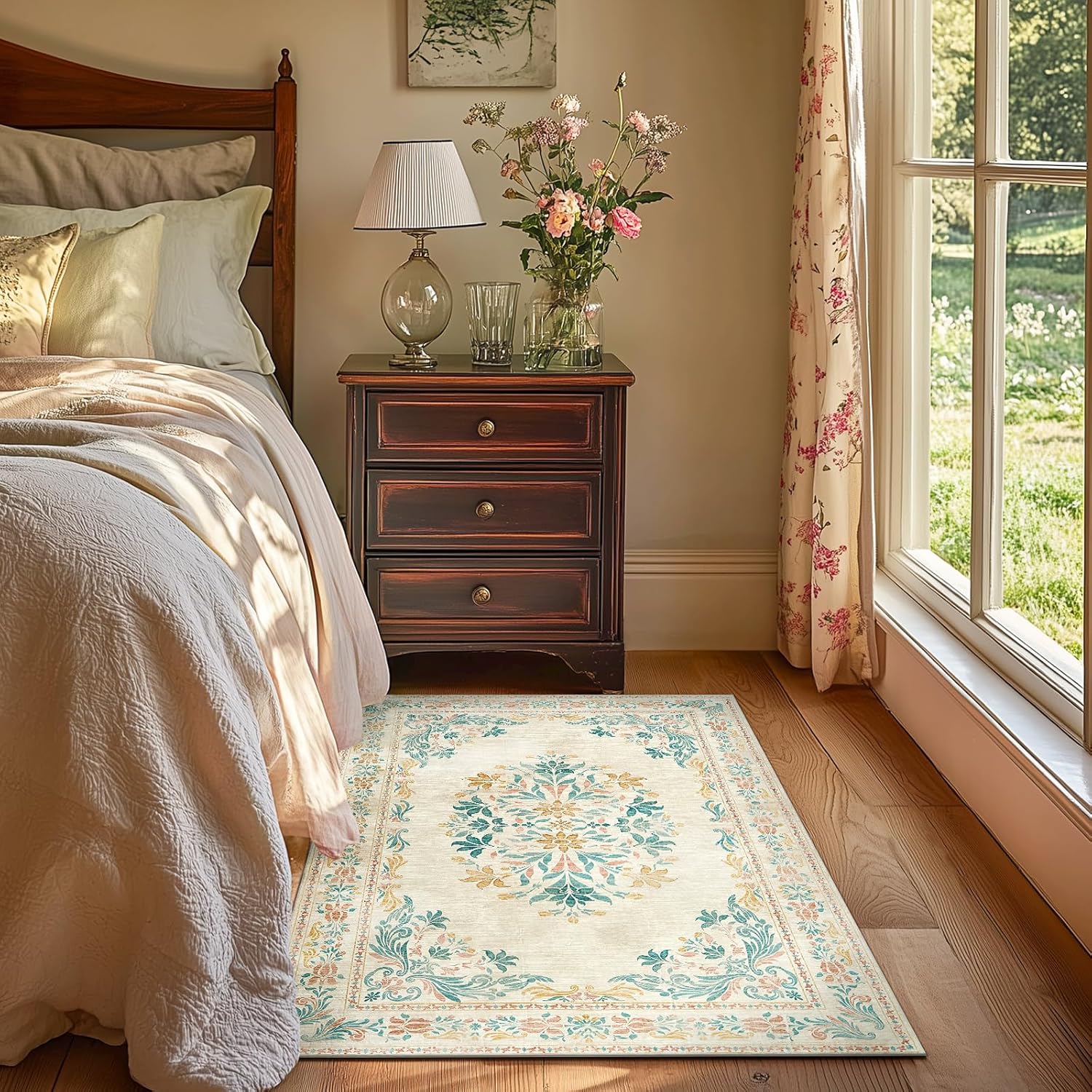 jinchan Vintage Floral 3x5 Area Rugs for Entryway - Machine Washable Distressed Design Ultra-Thin Low-Pile Soft Non-Shedding Carpet for Kitchen Bedroom Laundry Living Room (3x5ft,Apricot Multi)