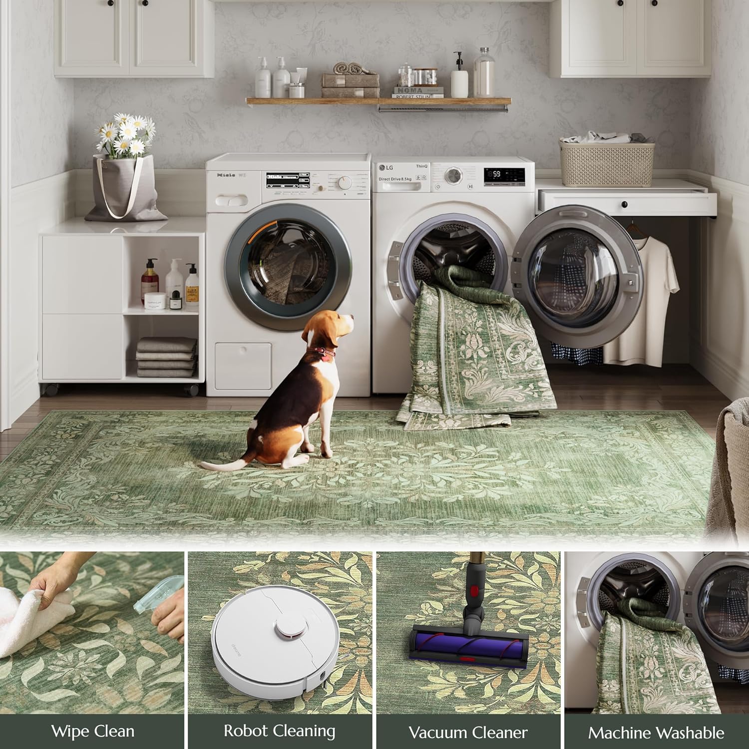 jinchan Green Floral 8x10 Area Rugs for Living Room - Machine Washable Vintage Distressed Design Soft Throw Rug Non-Slip Large Carpet for Bedroom Nursery Dining Room Home Office (8x10ft,Dark Green)
