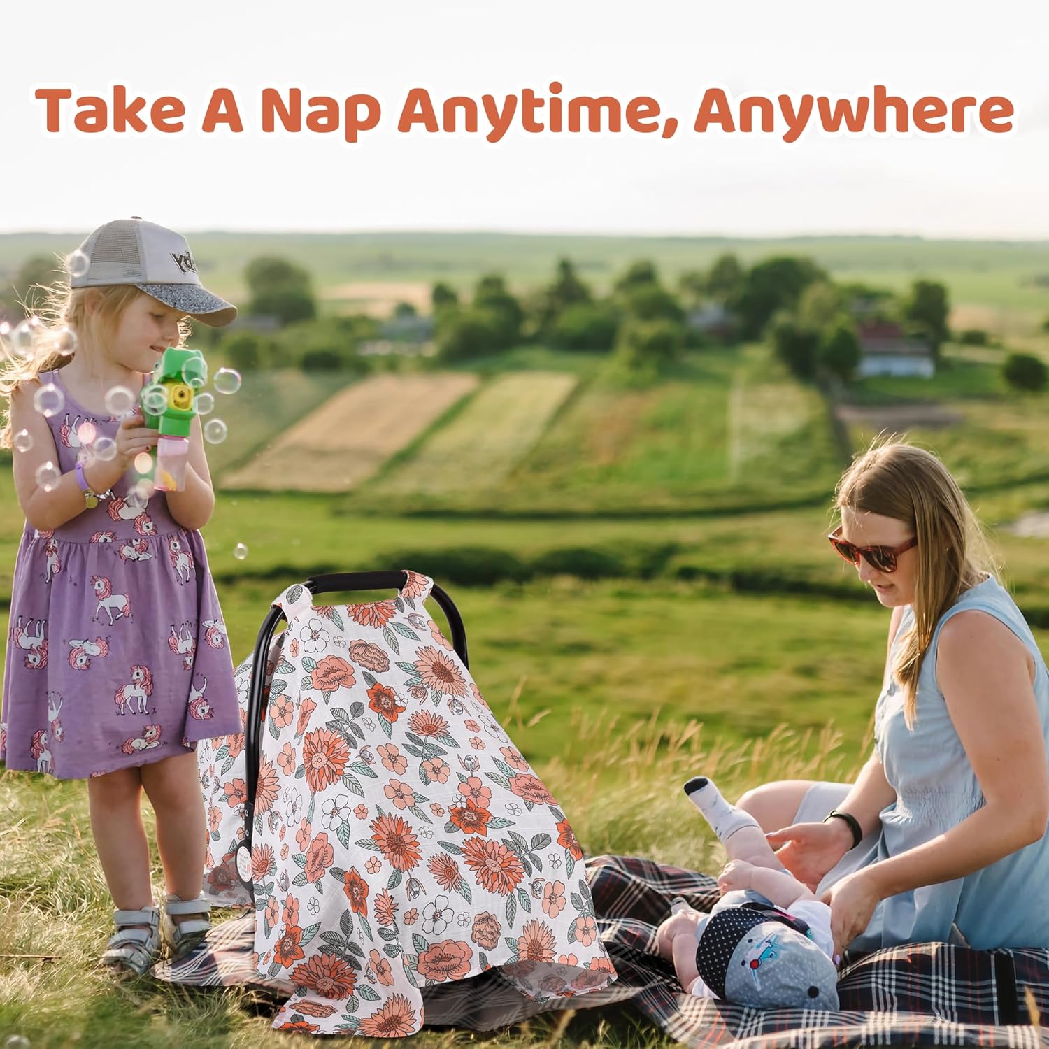 Rquite Car Seat Cover, Muslin Cotton Infant Car Seat Canopy, Breathable Baby Carrier Cover, Summer Stroller Sun Shade, Flower