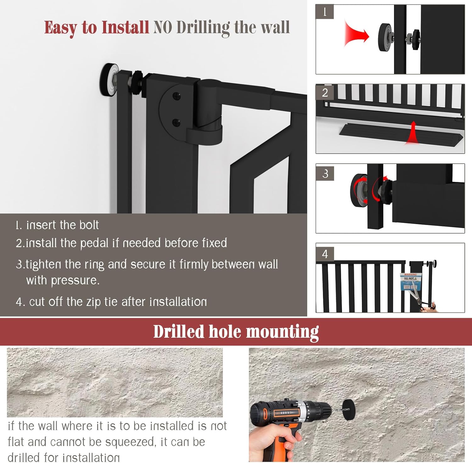 - 【Two Installation Methods】The baby gate has two installation methods. PRESSURE MOUNTING: The enclosure comes with 4 adjustable pressure bolts, no tools required, no drilling, no damage to house walls. Simply turn the nuts to secure or remove the gate from the wall or other surfaces for easy storage. DRILLING INSTALLATION: Simply drill holes in the wall and tighten the corresponding screws. Please do not cut the straps before successfully installing the extra high cat door, please follow the provided instructions carefully, if you encounter any installation problems, please contact us