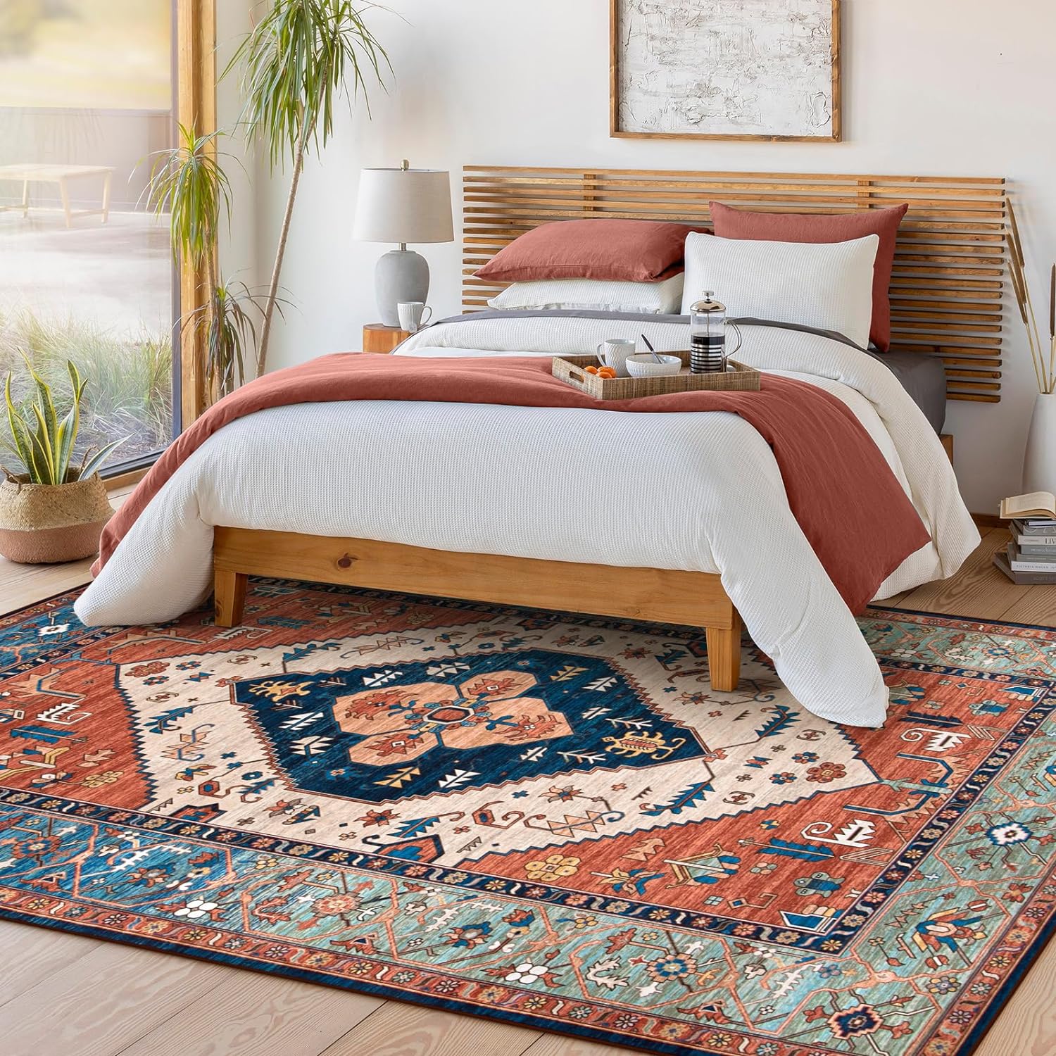 Lahome 8 x 10 Area Rugs for Living Room - Boho Washable Non-Slip Backing Large Rug Ultra-Thin Stain Resistant Dining Room Rugs for Under Table, Oriental Print Carpet Rugs for Bedroom (Rust, 8'x10')
