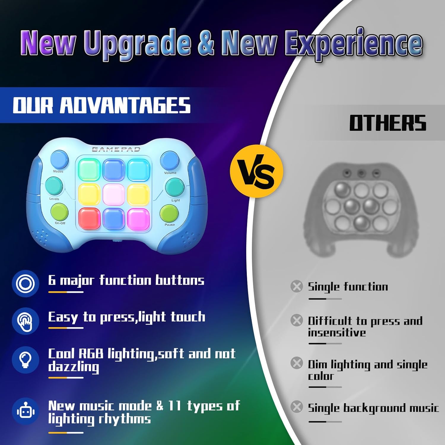 - 【2024 Newest Fast Push Gamepad】Upgrade 999 levels to bring more challenges to players! Let players think positively and react quickly in the challenging levels!Upgraded RGB ambient light with 7 colors to enhance players' visual experience.Soft eye protection without flicker, dark light environment can also play!
