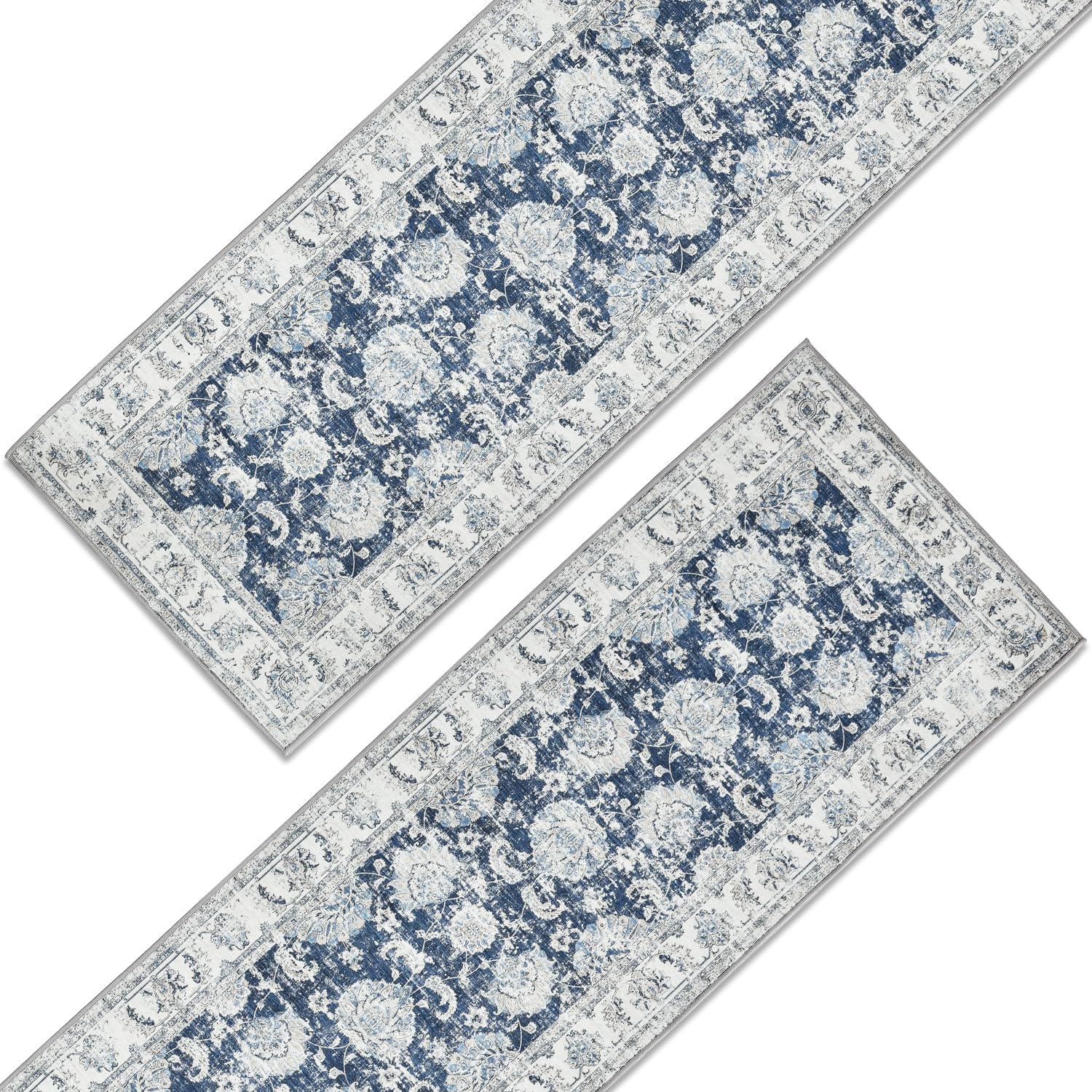 jinchan Runner Rug 3x10-2pcs Kitchen Washable Vintage Hallway Rug Floral Print Floor Cover Indoor Thin Retro Mat Accent for Bathroom Laundry Room Bedroom Office Farmhouse (Double,Dark Blue)