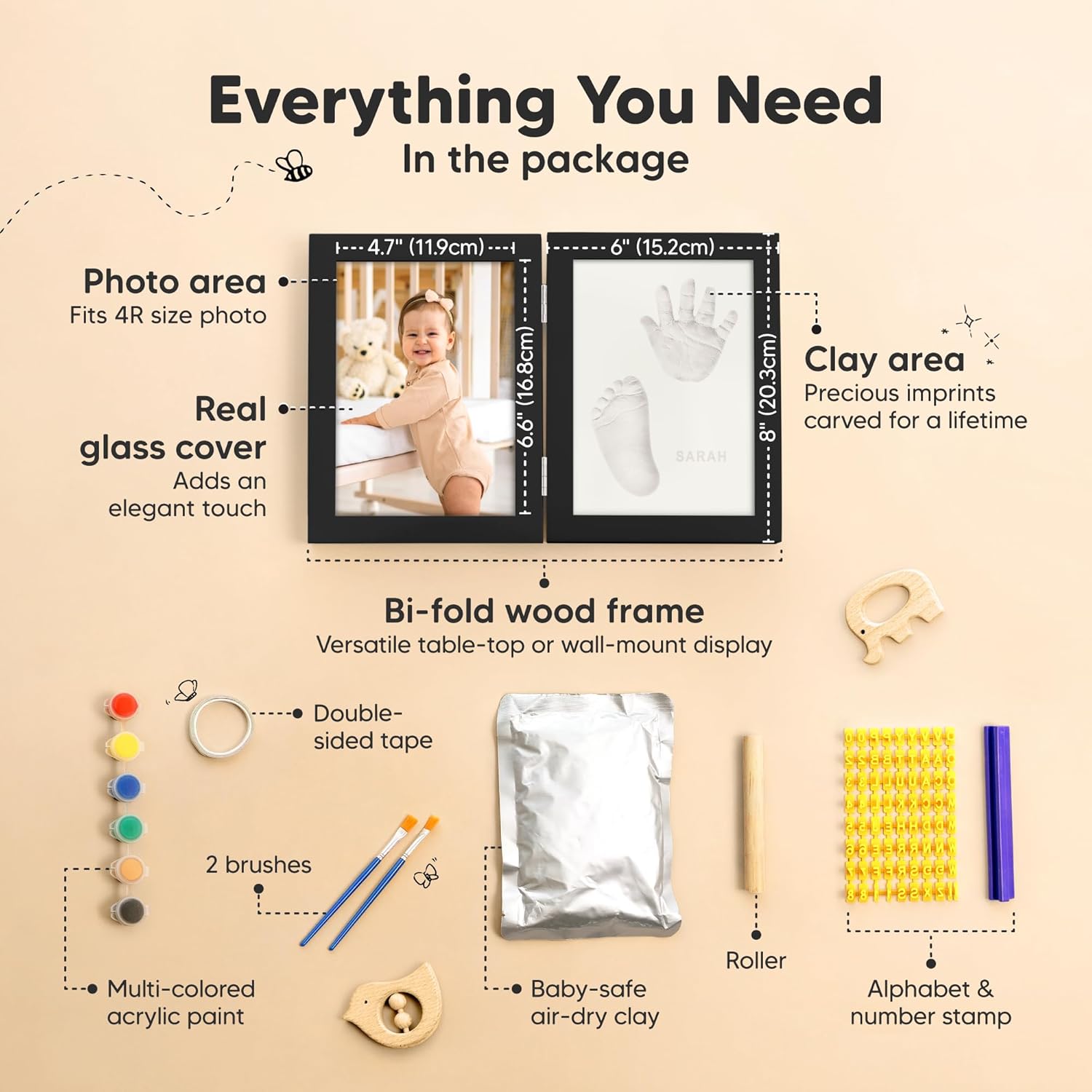 - All-in-one Baby Handprint and Footprint Kit - An elegant bi-fold Rune wooden frame with real glass cover, baby-safe air-dry clay, a wooden roller, alphabet stamps, paint and brush for personalization, and double-sided tape to keep it all in place.