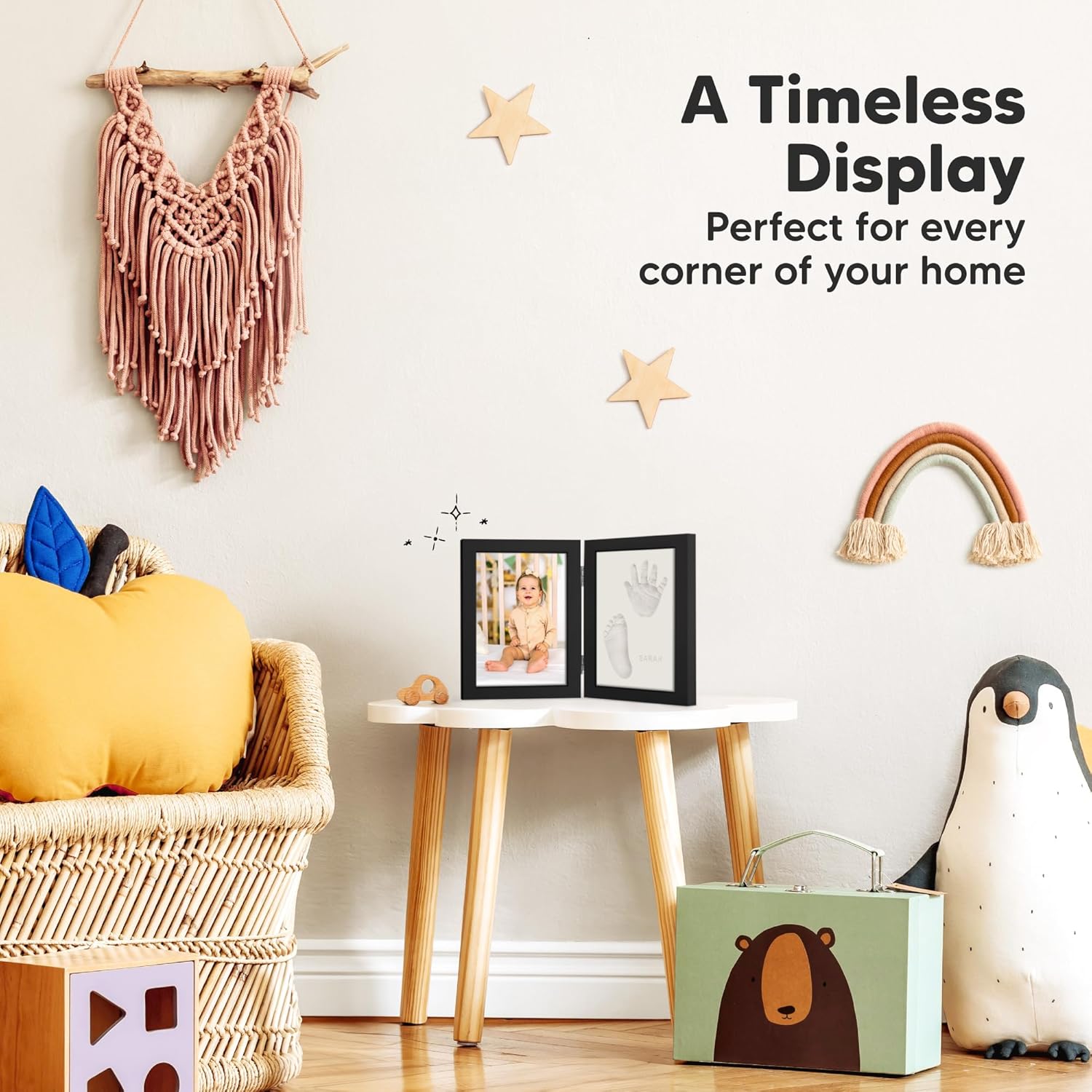 - Charming Keepsake - Timeless, modern, charming. The Rune Baby Keepsake Picture Frame, with its unique bi-fold design is perfect for wall or tabletop. This gender-neutral piece for boys & girls adds a touch of cuteness and liveliness to your nursery.