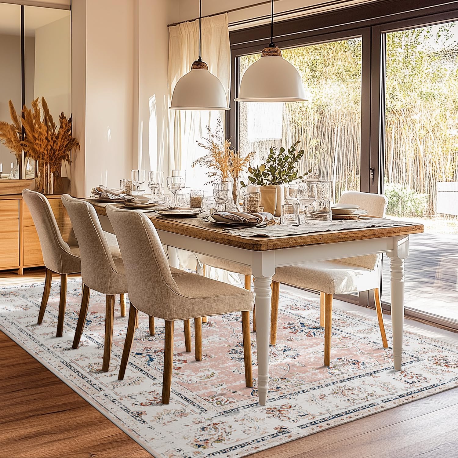 jinchan Washable Area Rug 5x7 Ultra-Thin Low Pile Non Slip Stain Resistant Soft Faux Wool Spring Floral Distressed Vintage Carpet for Bedroom,Living Room,Dining Room,Kitchen,Nursery(Pink, 5' x 7')
