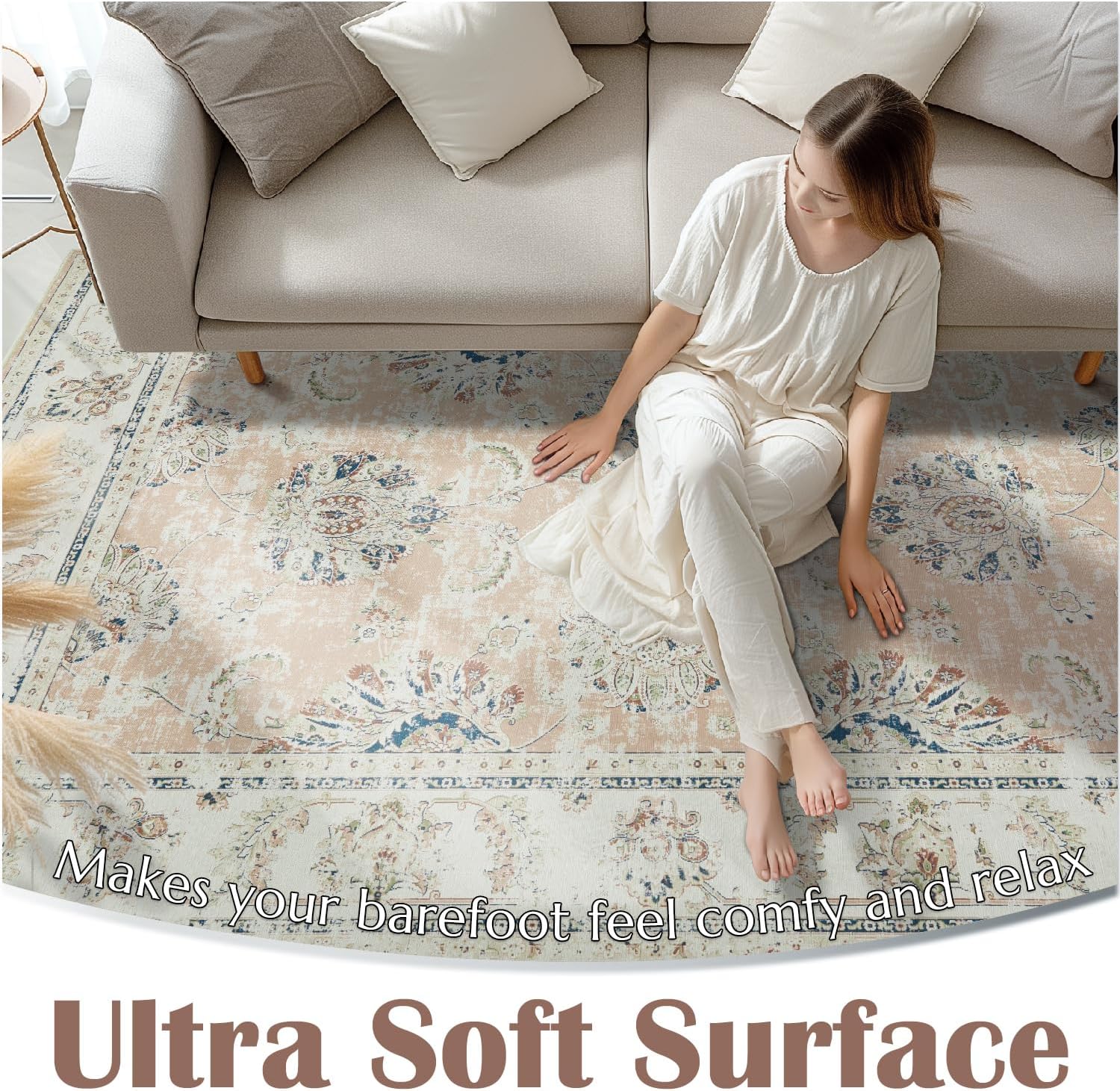jinchan Washable Area Rug 4x6 Ultra-Thin Low Pile Non-Slip Stain Resistant Soft Faux Wool Spring Floral Rug Distressed Vintage Carpet for Bedroom,Living Room,Dining Room,Kitchen,Nursery(Pink, 4' x 6')