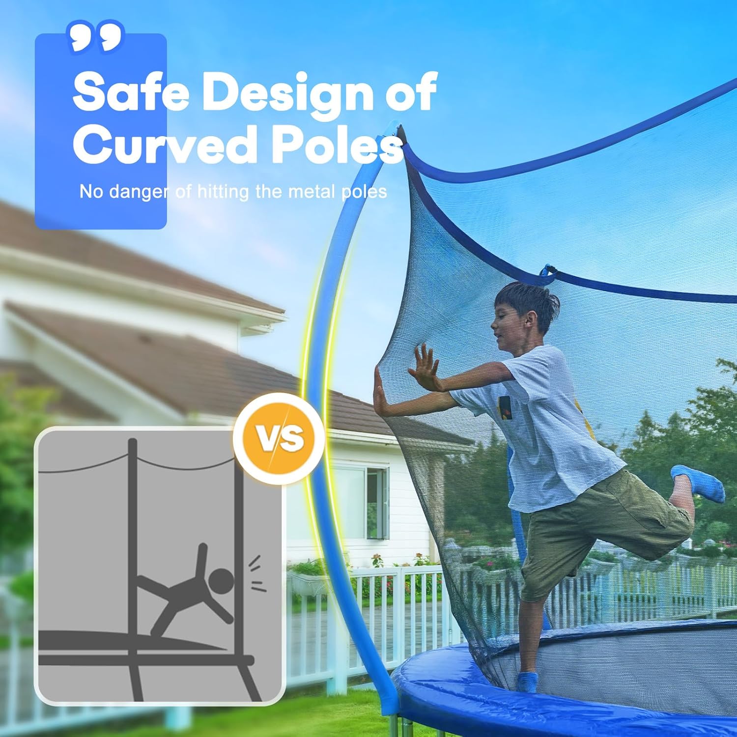 - 【Curved Net Poles】Our trampolines feature outwardly curved net poles positioned away from the enclosure net, eliminating collision risks. This design ensures a safe and worry-free jumping experience, allowing kids to enjoy endless fun with maximum safety.