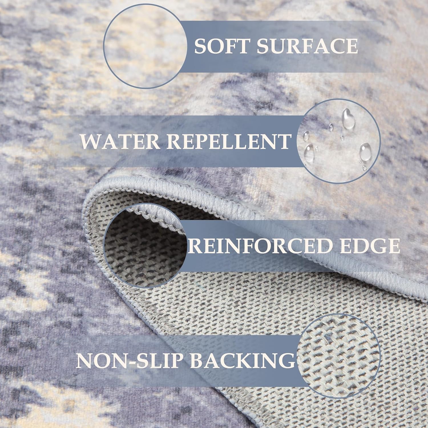 - Tides Series – Effortless style that flows with your life.This modern machine-washable non-slip rug features reinforced edges and a low-pile design that resists dirt. Its water-repellent surface makes spills easy to clean - liquids bead up for quick wiping. Simply machine wash in cold water (no bleach) to refresh. The non-slip backing keeps it securely in place. A perfect blend of function and contemporary design for active homes.