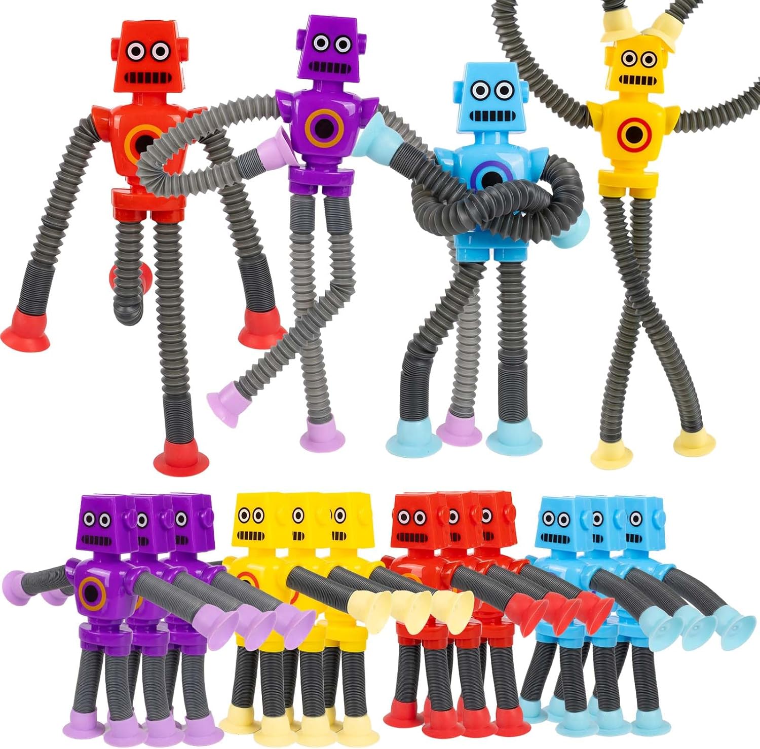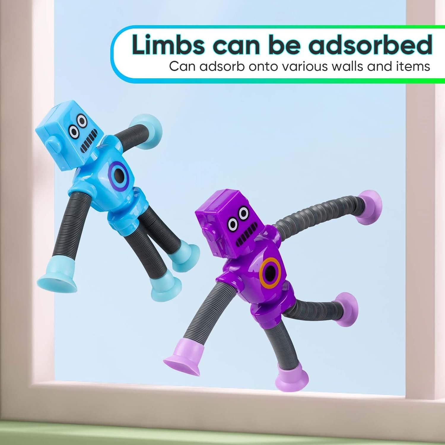 - 【Telescopic Suction Cup Robots Fidget Toys】- Shape Changing Pop Tubes Robot Fidget Toys Creative robots pop tubes sensory toys for toddlers. The robot's arms and legs are stretchable bursting tubes, and the other end of the tube has a suction cup that can be firmly fixed on any smooth surface. The tube can be popped and stretched with a crisp sound,