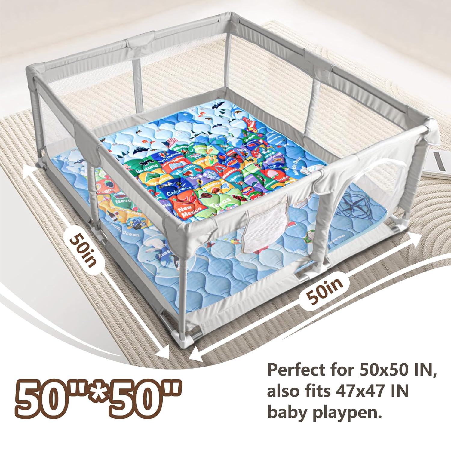 Baby Play Mat, 50x50 Playpen Mat with Super Soft Touch, Thick Activity Mat with Upgraded Anti-Slip Bottom, Machine Washable Crawling Mat for Floor & Picnic (Map)