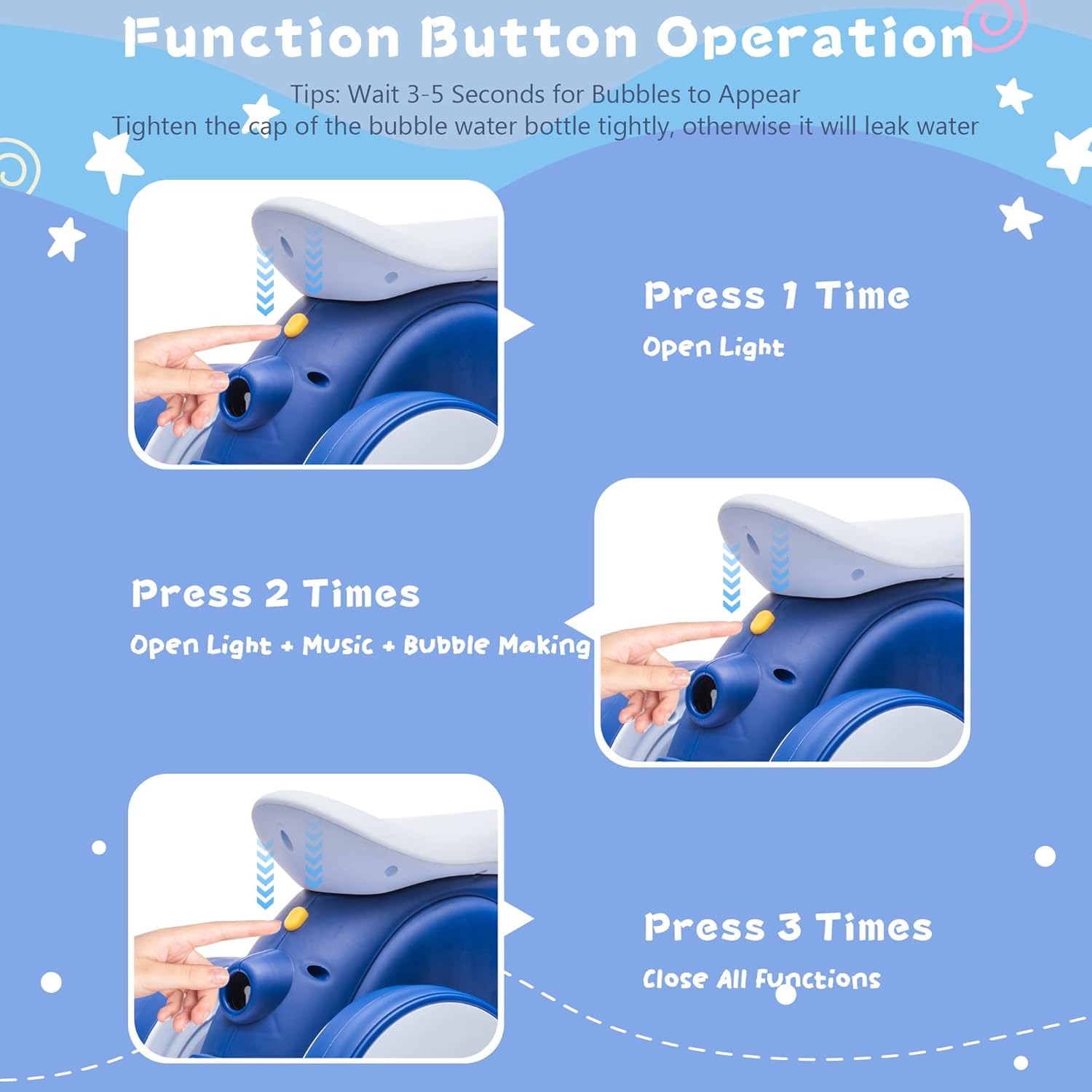 - Comfortable Children Balance Motorbike with Remote & Bubble Machine: Our ride-on toy features a non-slip soft handlebar designed for small hands, while the wider and thicker seat offers excellent shock absorption. With durable EVA wider tires that are noiseless and gentle on wooden floors, and 4 wheels for a smooth ride on various surfaces, it's perfect for both indoor and outdoor activities.