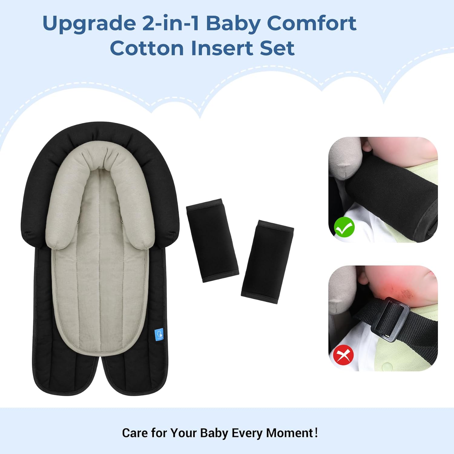 - Babybody Support and Strap Cover Set: The seat liner baby car seat insert has a clever nested design, cotton fabric padding is soft and breathable, suitable for all seasons. Reversible baby body cushion pad is ultra soft to the touch, absorbent, hypoallergenic, and sturdy