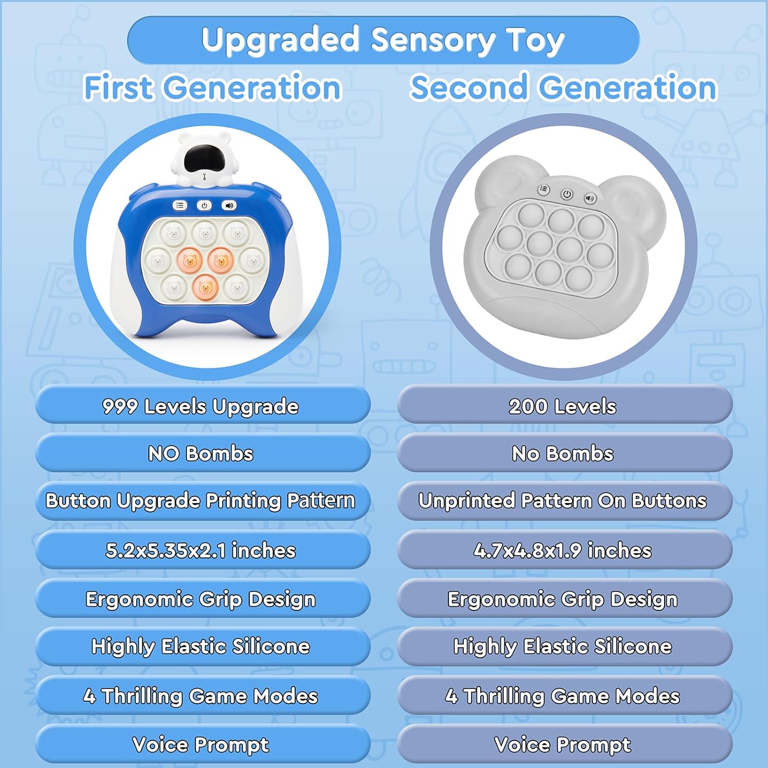 - 【Handheld Bubble Game】 This compact quick push game machine lets players advance through levels by quickly pressing buttons. It encourages positive thinking, hand-eye coordination, and cognitive development with engaging challenges featuring lights and sounds, enhancing your child’s sensory skills.