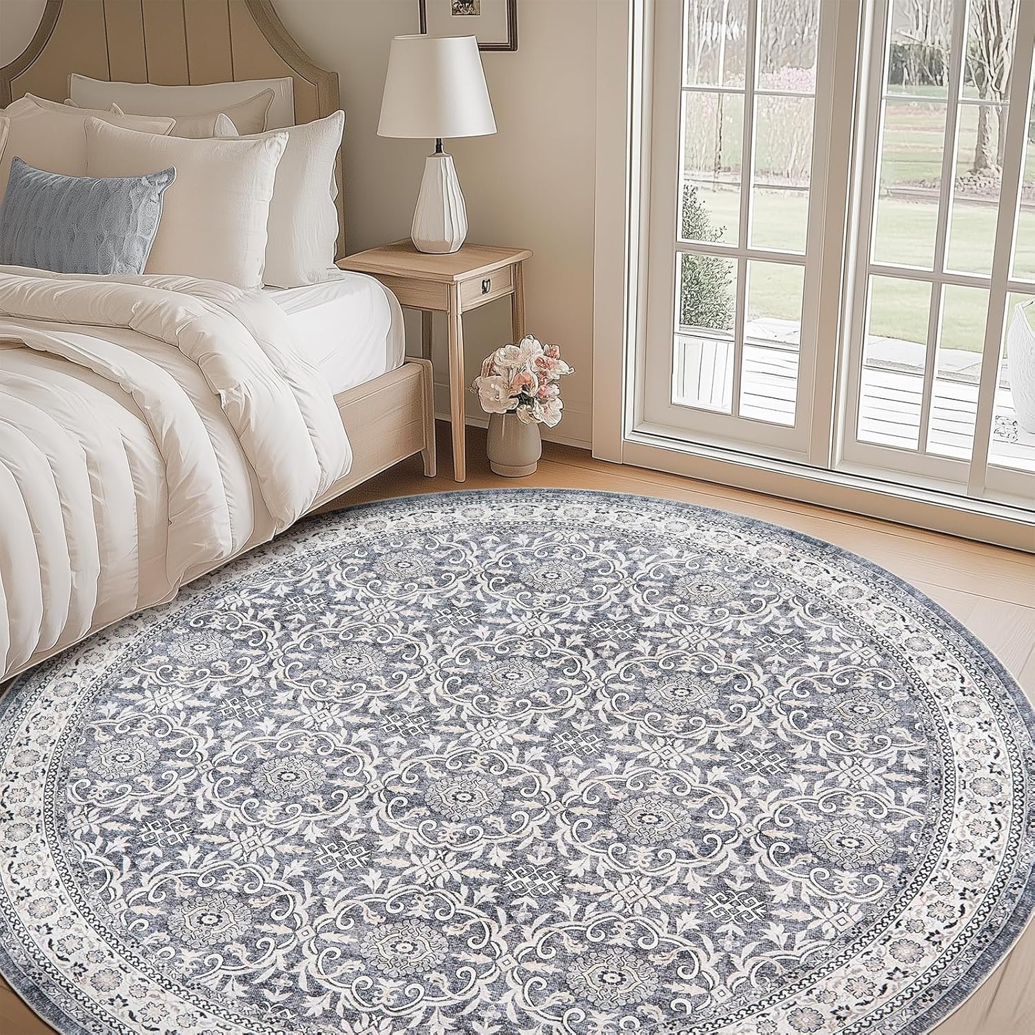 jinchan Round Rug 8ft Washable Circle Soft Rug - Low Pile Vintage 8'Round Indoor Grey Floral Print Stain Resistant Boho Carpet Ultra-Thin Non-Slip for Living Room Bedroom Dining Room Kitchen