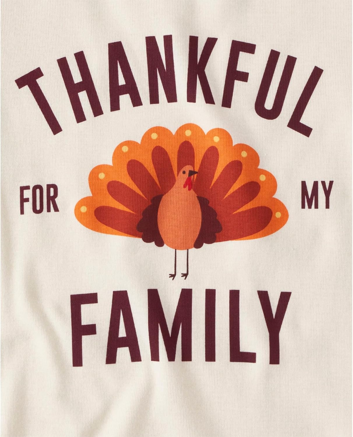 - PAJAMA TOP: Contrast rib-knit crew neck, long raglan sleeves, 'Thankful For My Family' with turkey graphic design at front