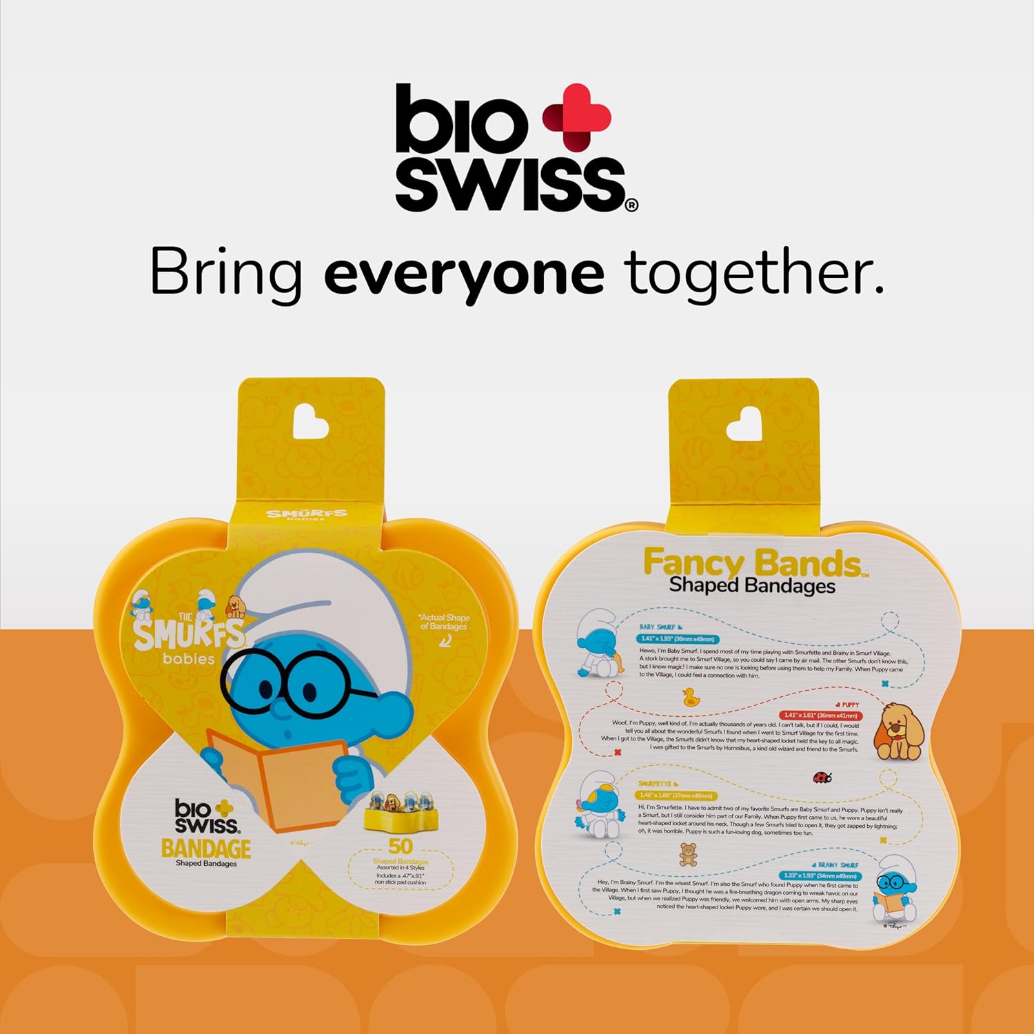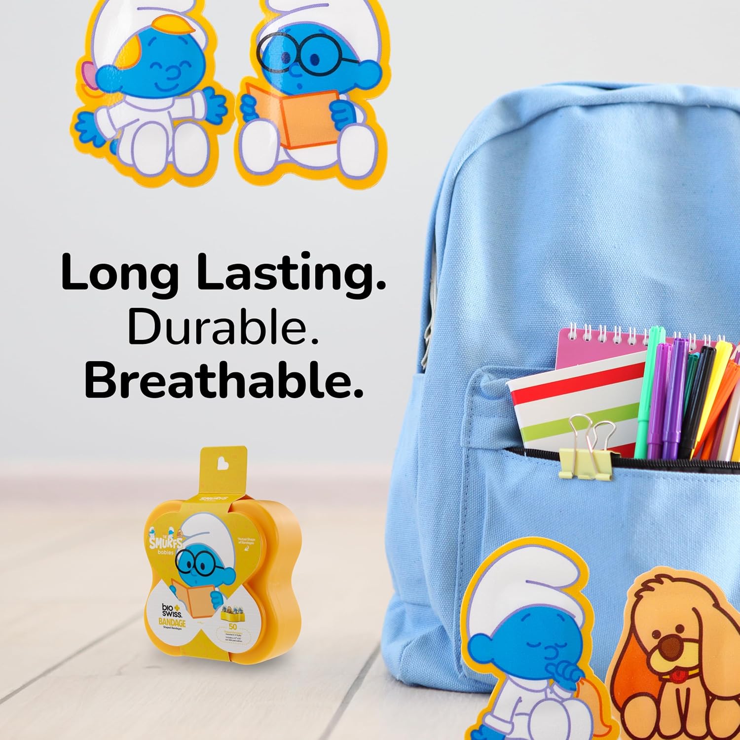 - BABY SMURF BANDAGES: This 50 piece plastic case of childhood classic cartoon Baby Smurf shaped bandages is great for putting a smile on kids' faces while protecting wounds such as cuts, scrapes, and burns, and come in a variety of your favorite characters; Baby Smurf, Puppy, Brainy Smurf, and Smurfette. These sticky bandages are perfect for kids and adults alike, and also for school nurses and pediatric doctors