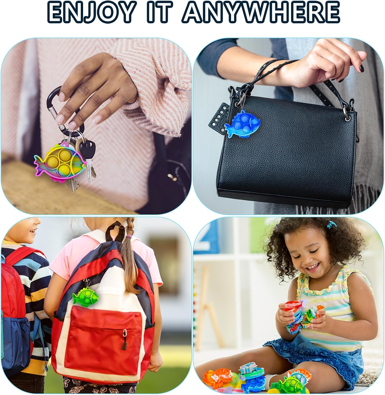 - Party Favors for Kids Carnival Prizes: This cute fish pop keychains for backpacks has bright colors, you will receive box of 12 pop keychain bulk toys for 3 year old boys, sensory fidgets toy pack fidgets for kids. It is also perfect as sensory toys for toddlers 3-4, kids fidget toy, desk toys, autism sensory toys, ADHD fidget toys, fidget toys for kids party gifts, sensory toys for kids 5-7, fidgets for teens, fidgets for girls 10-12, valentines day party favors valentines day gifts for kids.