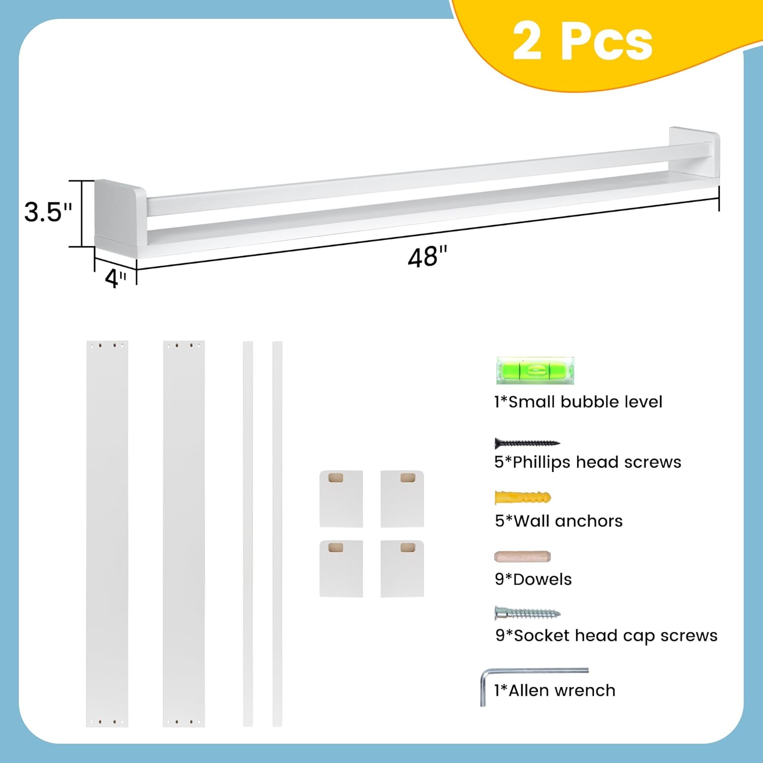 Fun Memories Nursery Book Shelves - Rustic Natural Solid Wood Floating Bookshelf for Kids - Wall Book Shelves for Kids Room (White, 48inch - 2P)