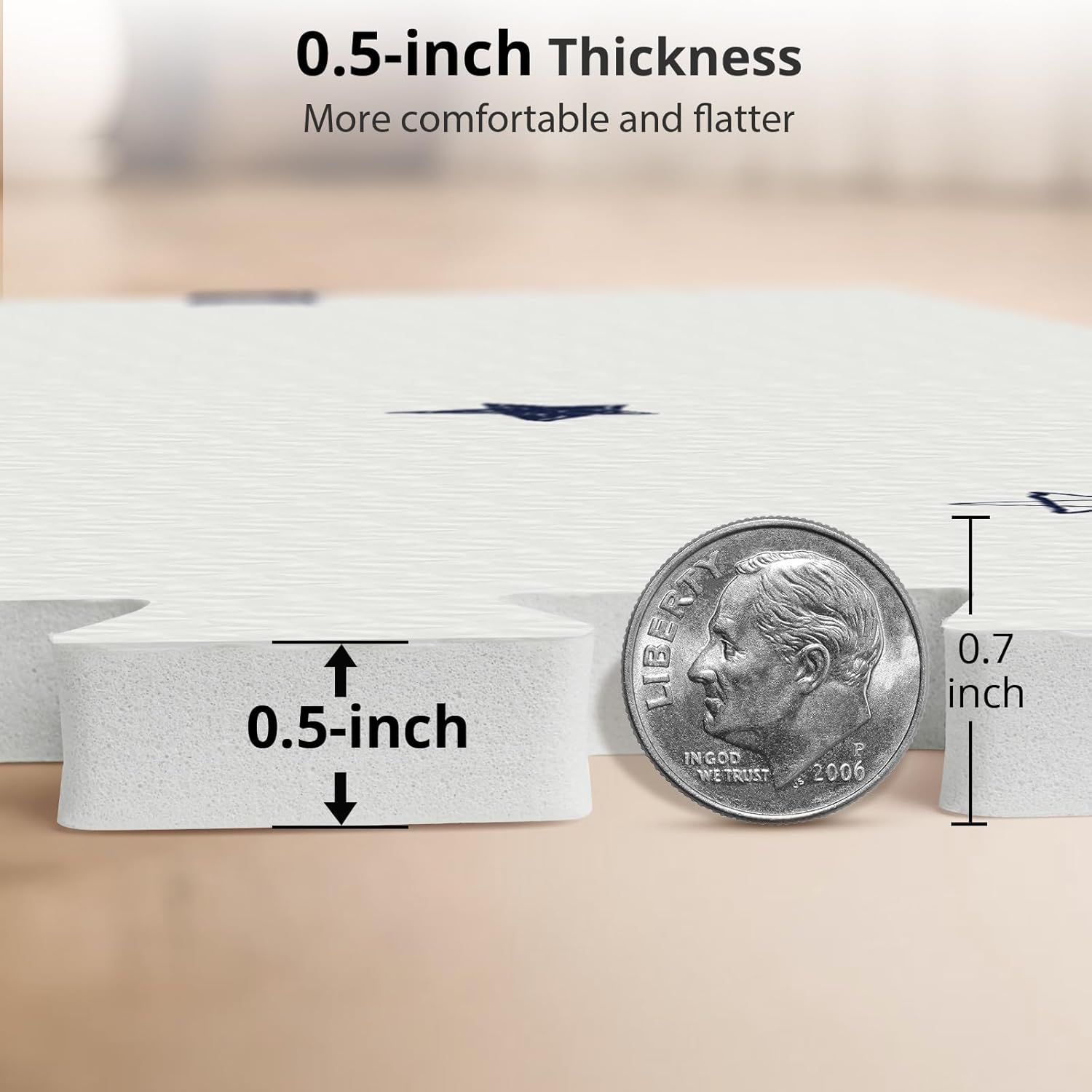 - MAXIMUM SAFETY: The 0.5" thick foam flooring tiles create a safe play area for little ones. Made from certified EVA foam through a batch process, The floor pads for babies ensure premium quality and are free from BPA, PVC, and other harmful substances.
