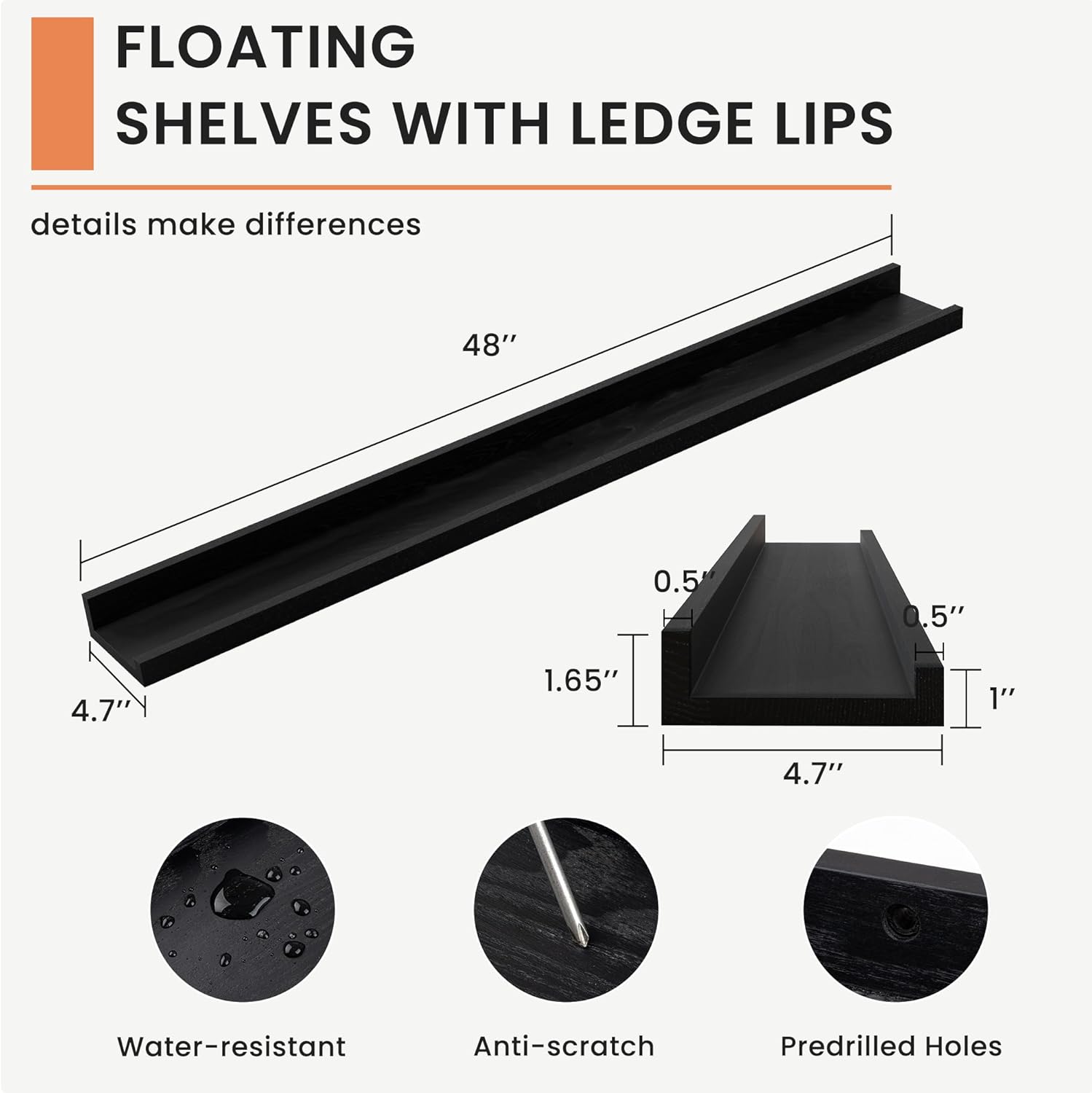 - Secure and Reliable: The mounting holes are expertly spaced at 16 inches to align perfectly with wall studs, ensuring a secure installation. Each wall shelf supports up to 45 lbs, This thoughtful design guarantees that your floating shelf with lip are anchored safely, offering stability and peace of mind for displaying any of your favorite items