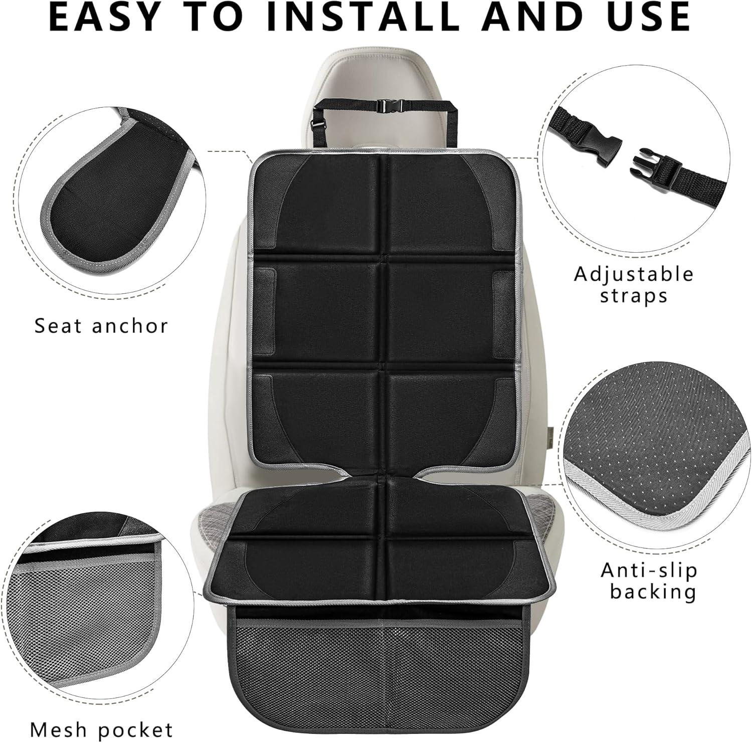 - Adjust the car seat protector top safaty straps and slip the flap into the car seat cushions. Non-slip backing increase friction and and prevents sliding, allows the child car seat protector to fit securely on the car seat, easy to install and use