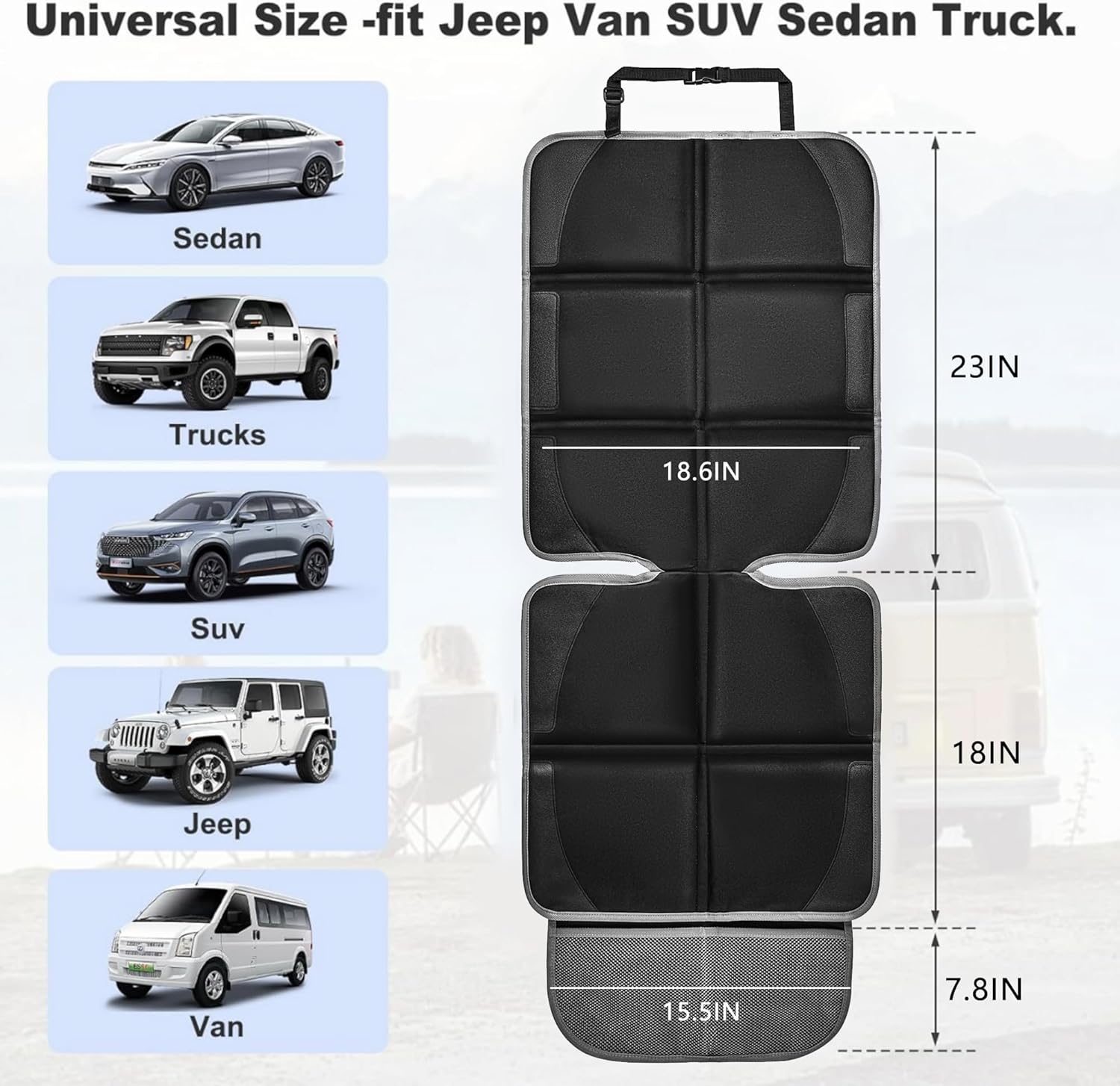 - The whole dimension of the auto seat protector carseat is 18.6 x 48.8 inch, the seat: 18 x 18.6 inch, the back: 23 x 18.6 inch, and the mesh pocket: 15.5 x 7.8 inch. Universal fit Jeep Van SUV Truck