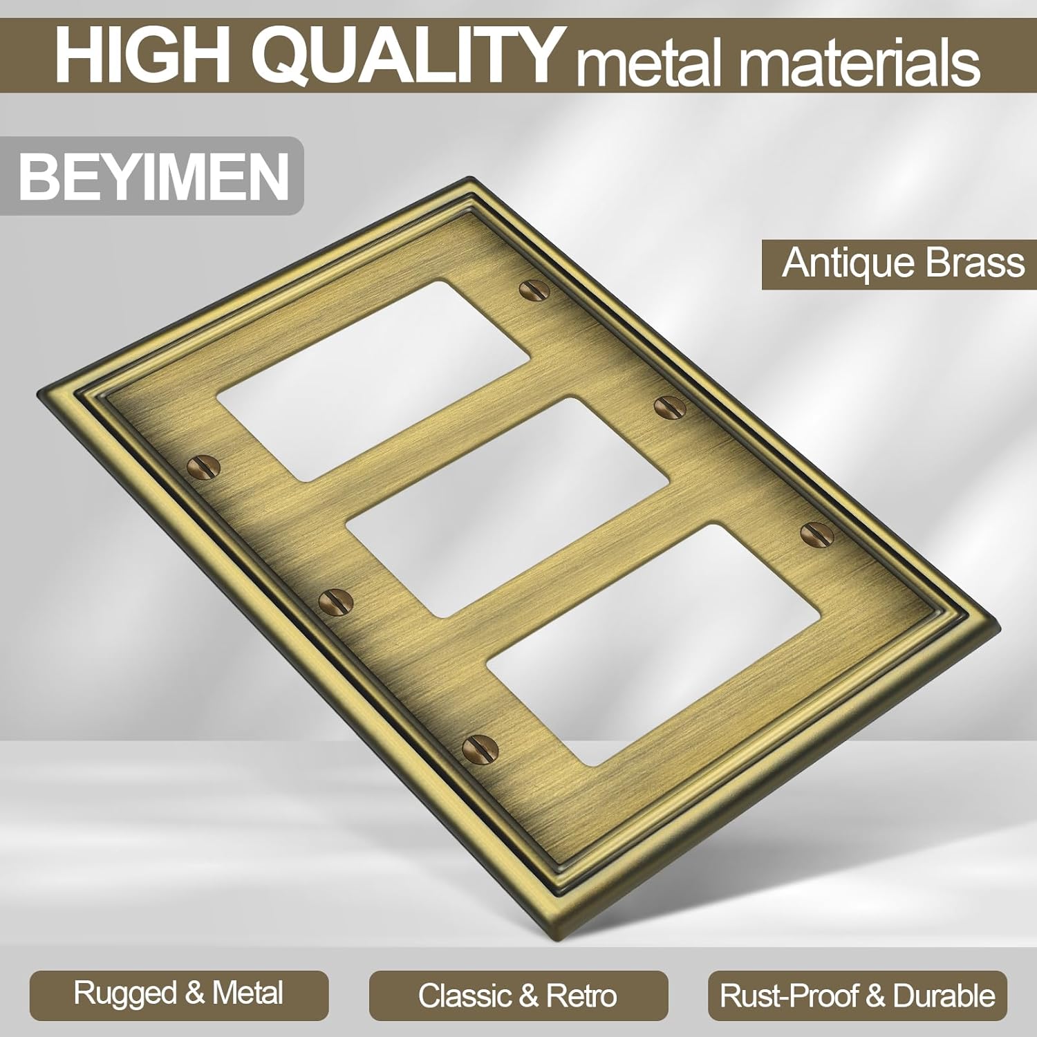2 Pack Triple Decorator Switch Covers Wall Plate, Antique Brass Metal Material Rocker Switch Plates, 3 Gang Wall Plate for Receptacle, GFCI Outlet, Dimmer Switch - Classic Style