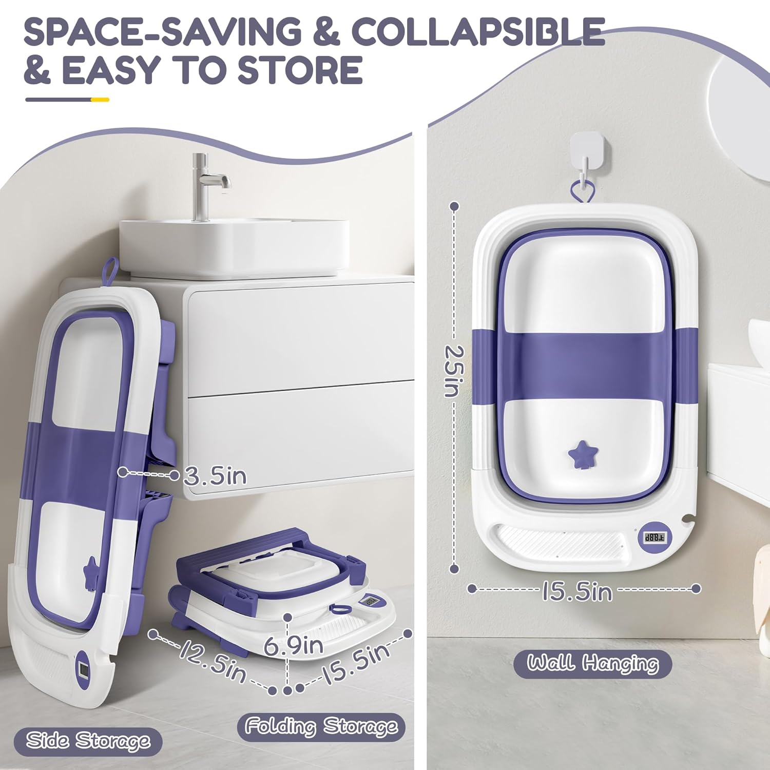 Collapsible Baby Bathtub,Baby Bath Tub with Thermometer & Soft Cushion,Baby Bathtub for Newborn to Toddler 0-36 Months,Portable Travel Baby Tub with No-Slip Feet,Baby Shower Gifts,Lavender