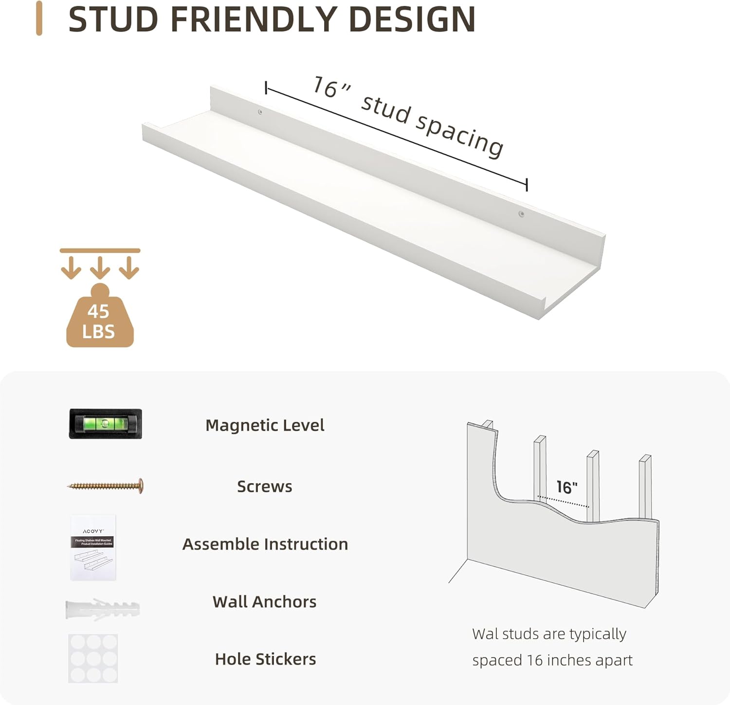 - ăSuperior Qualityă Crafted from high-quality wood, each floating shelf is designed for long-lasting durability. The pre-drilled mounting holes are spaced 16 inches apart, ensuring a secure installation into wall studs.