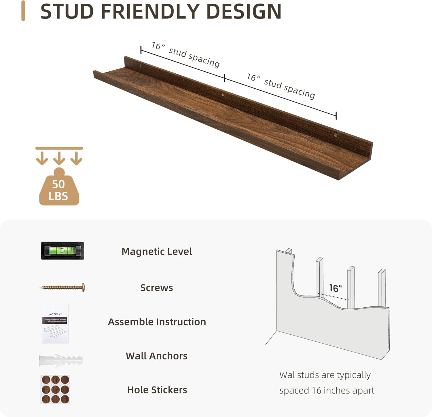 - ăSuperior Qualityă Crafted from high-quality material, each floating shelf is designed for long-lasting durability. The pre-drilled mounting holes are spaced 16 inches apart, ensuring a secure installation into wall studs.